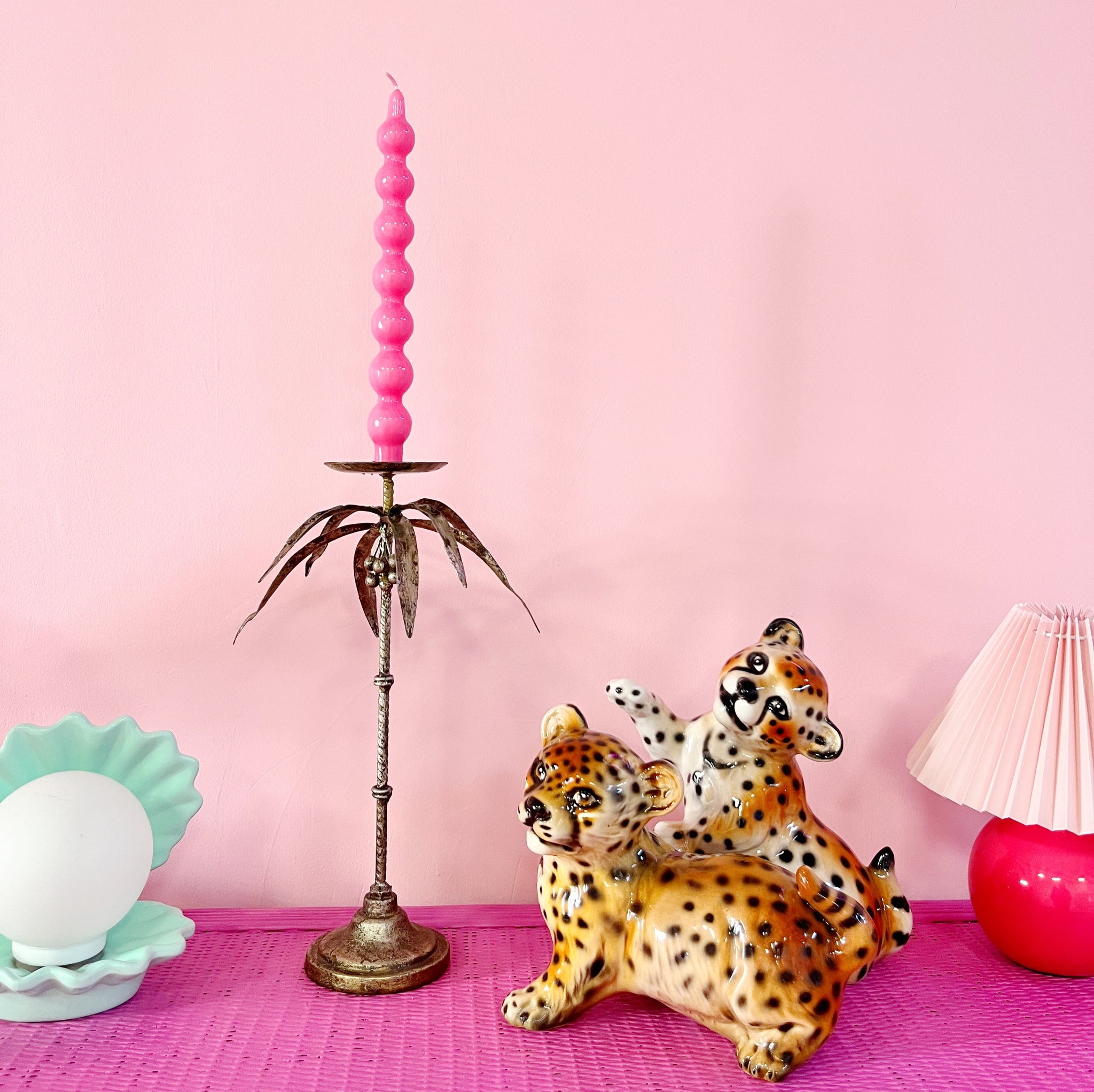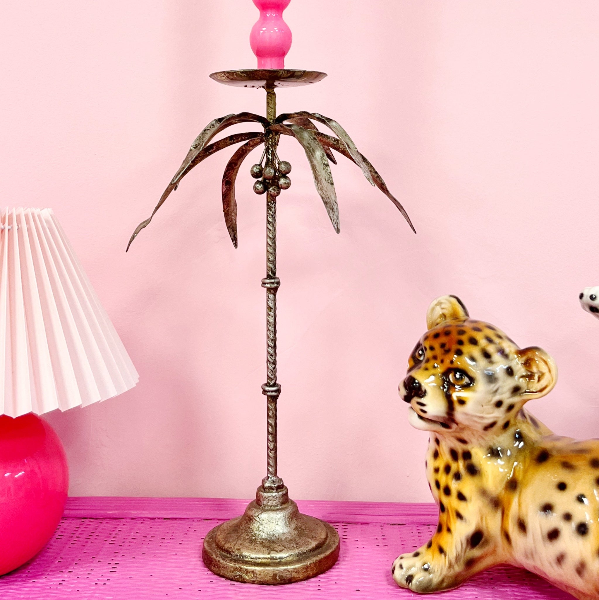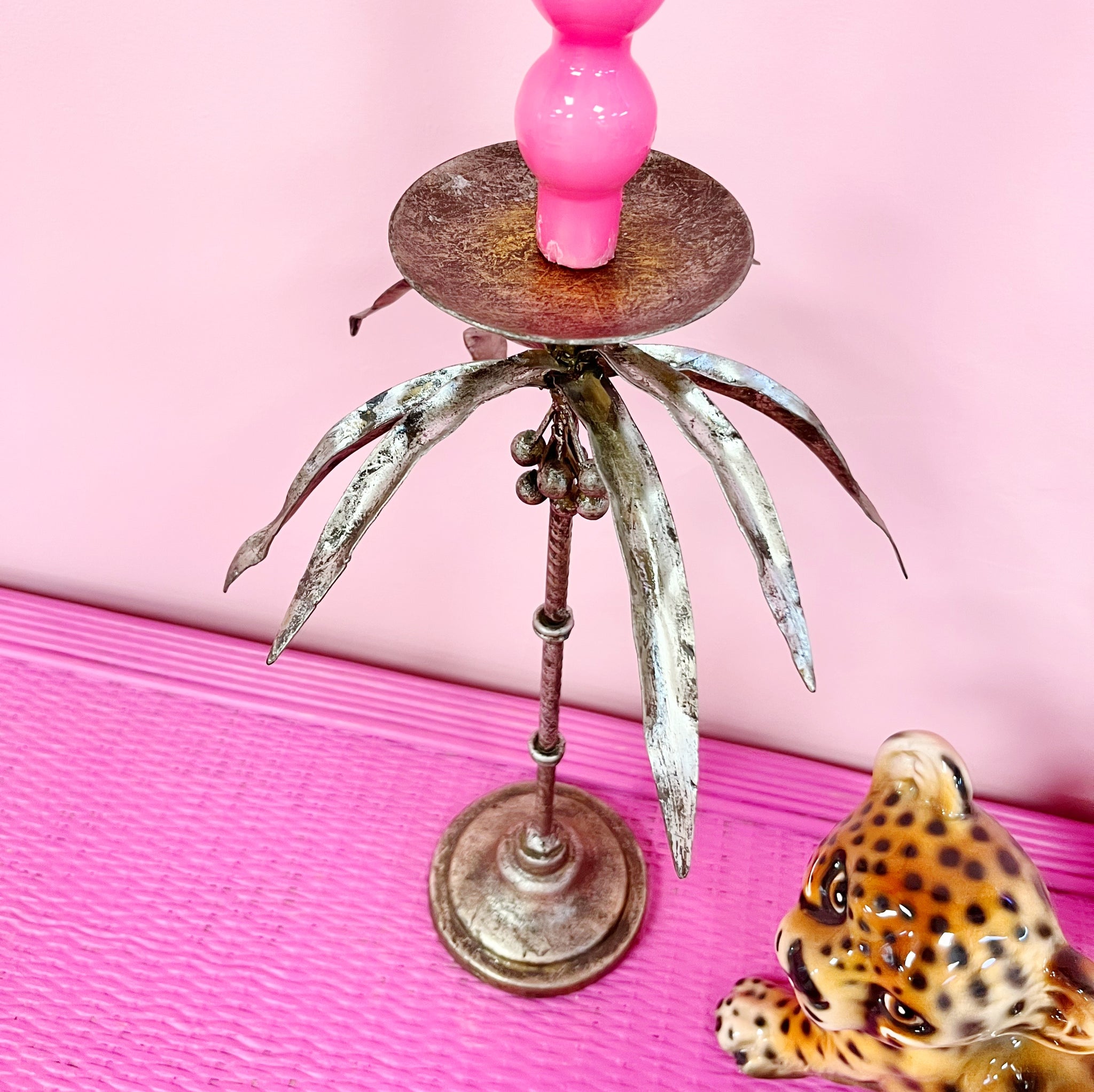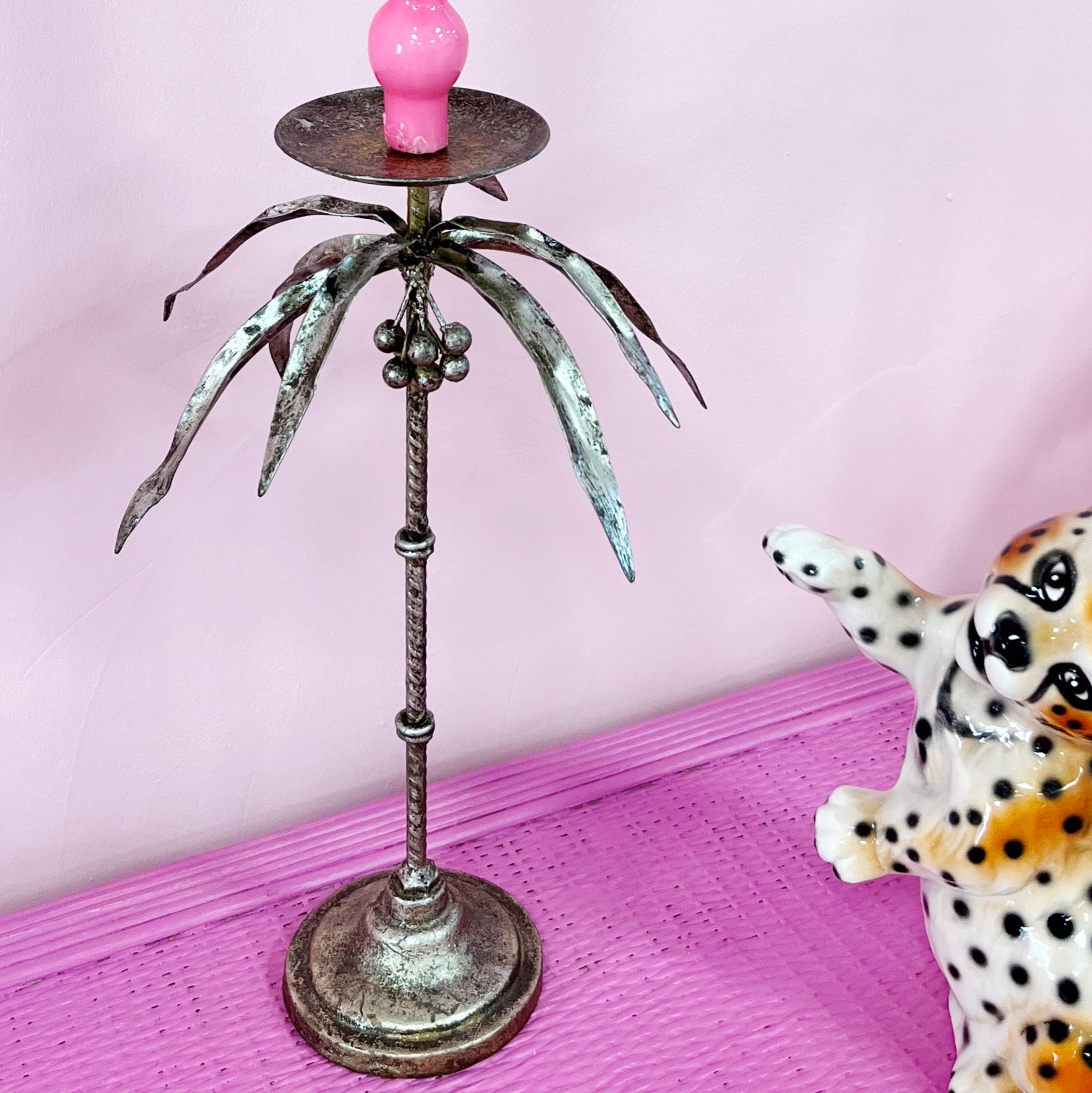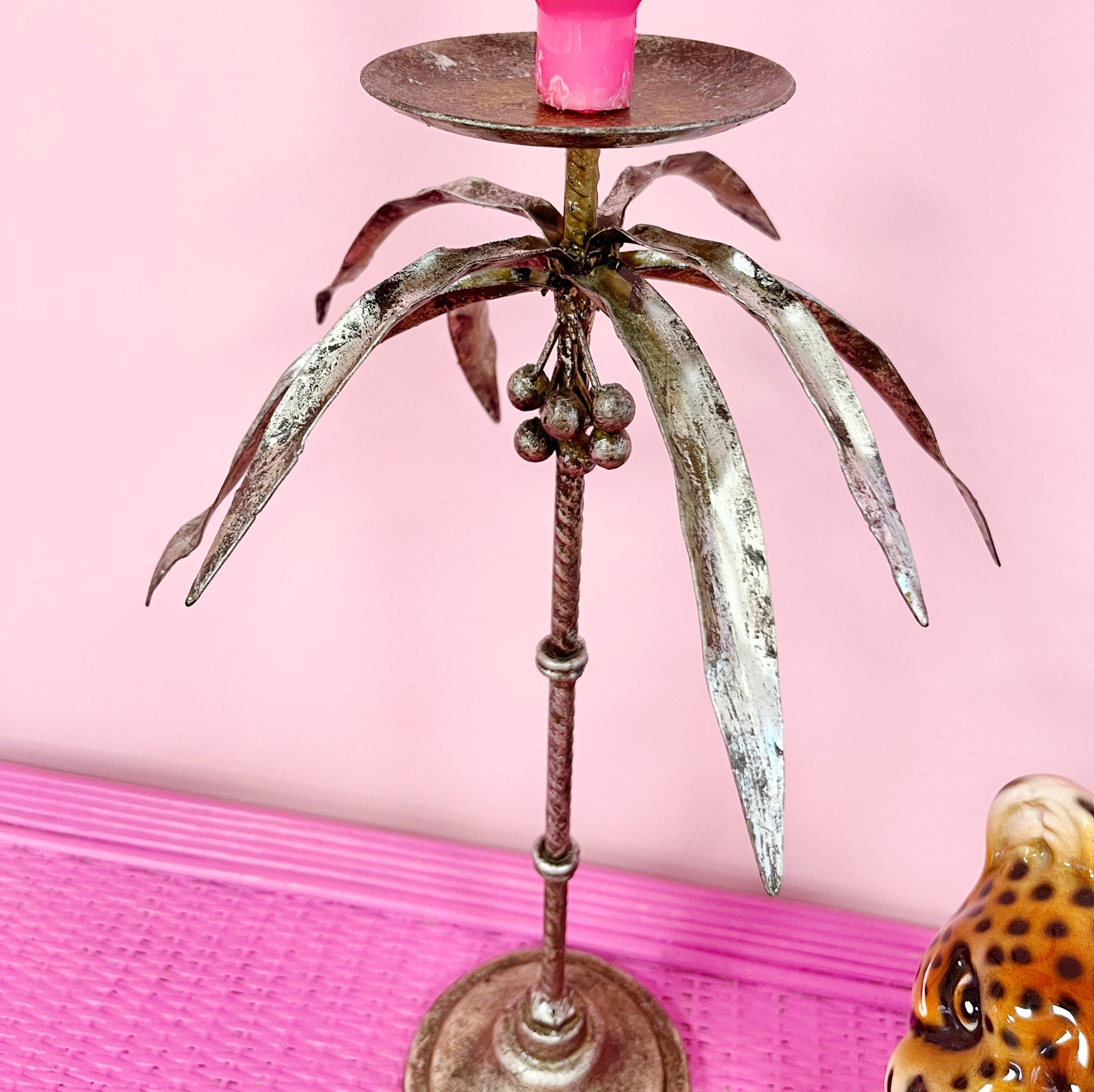 Magnifique bougeoir palmier-cocotier vintage en métal doré. On adore sa tige torsadée surmontées de délicates feuilles de métal évoquant un palmier. La touche Palm Beach chic pour un style Hollywood Regency.
