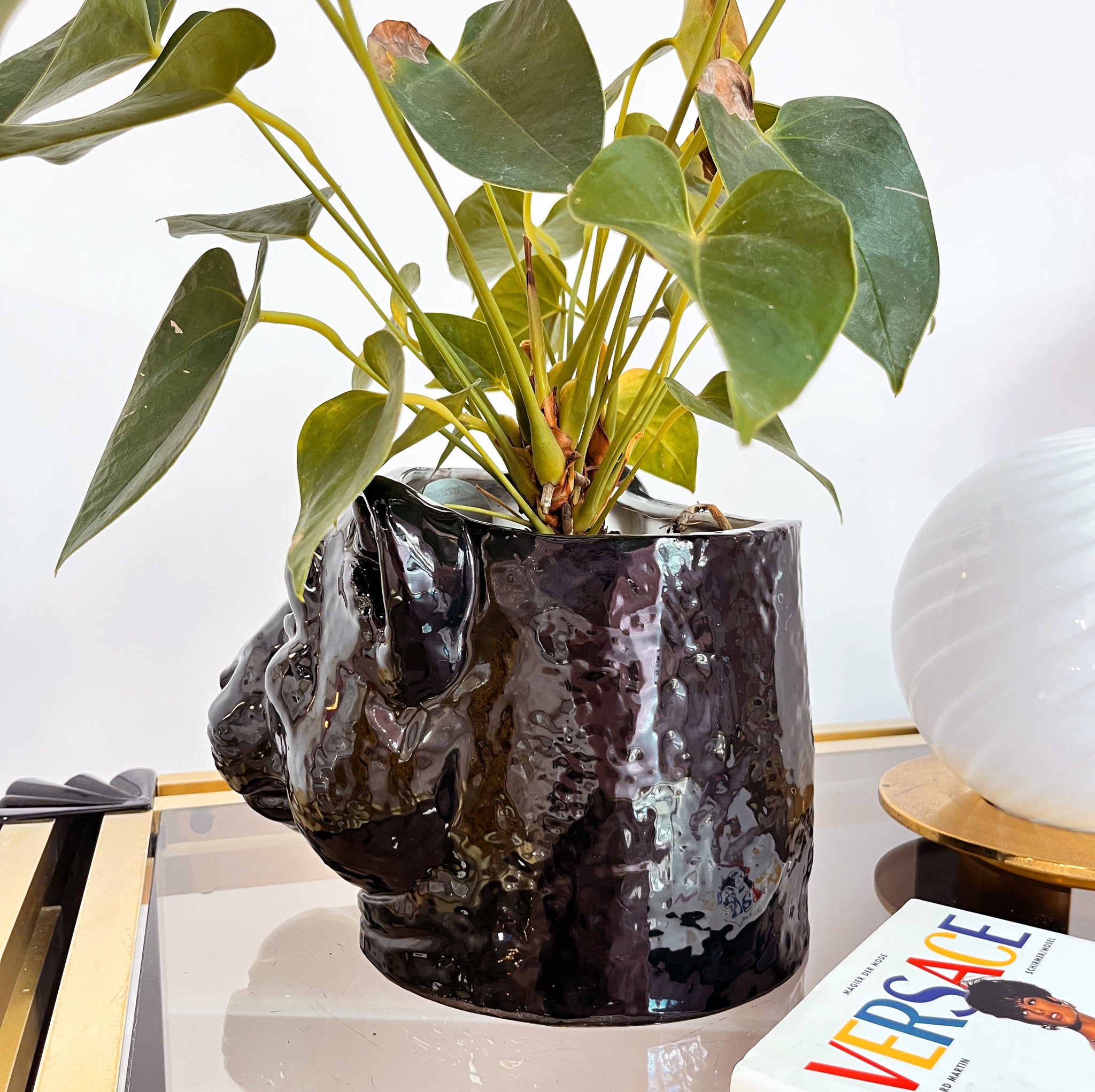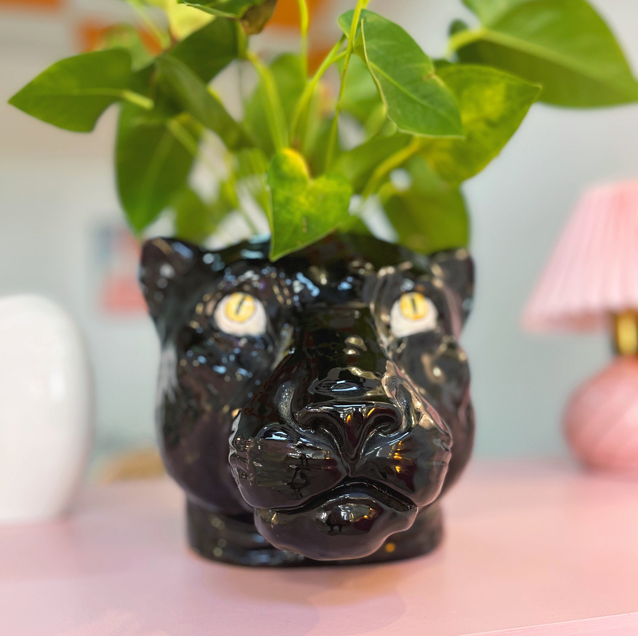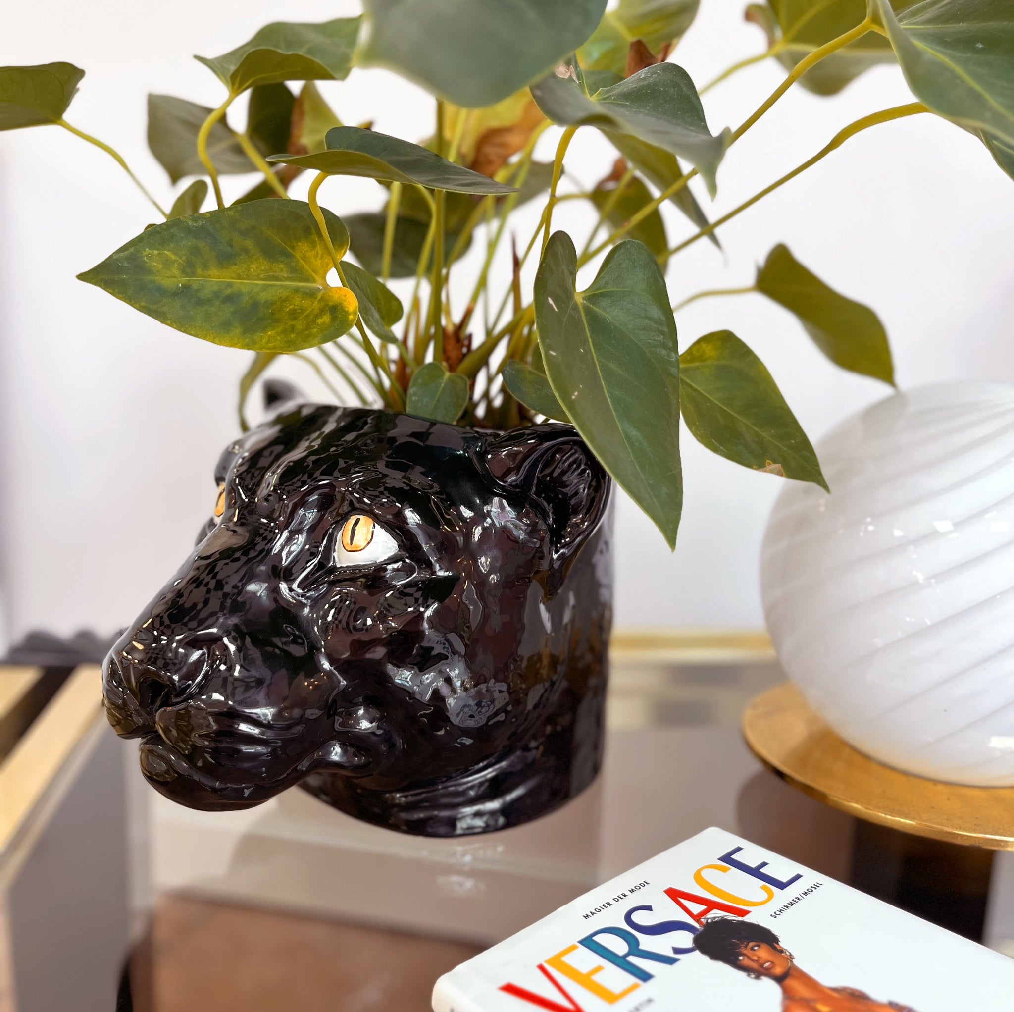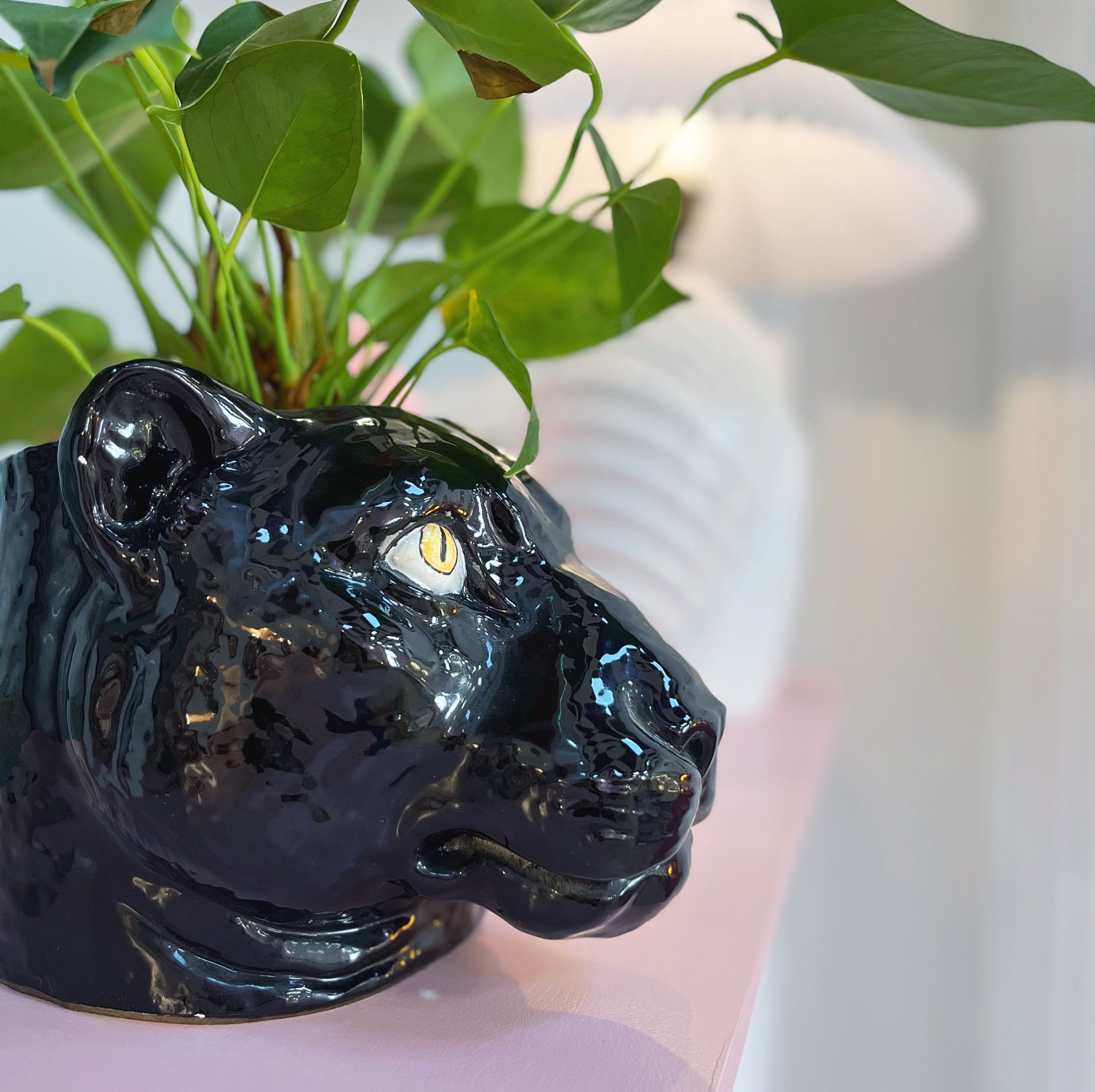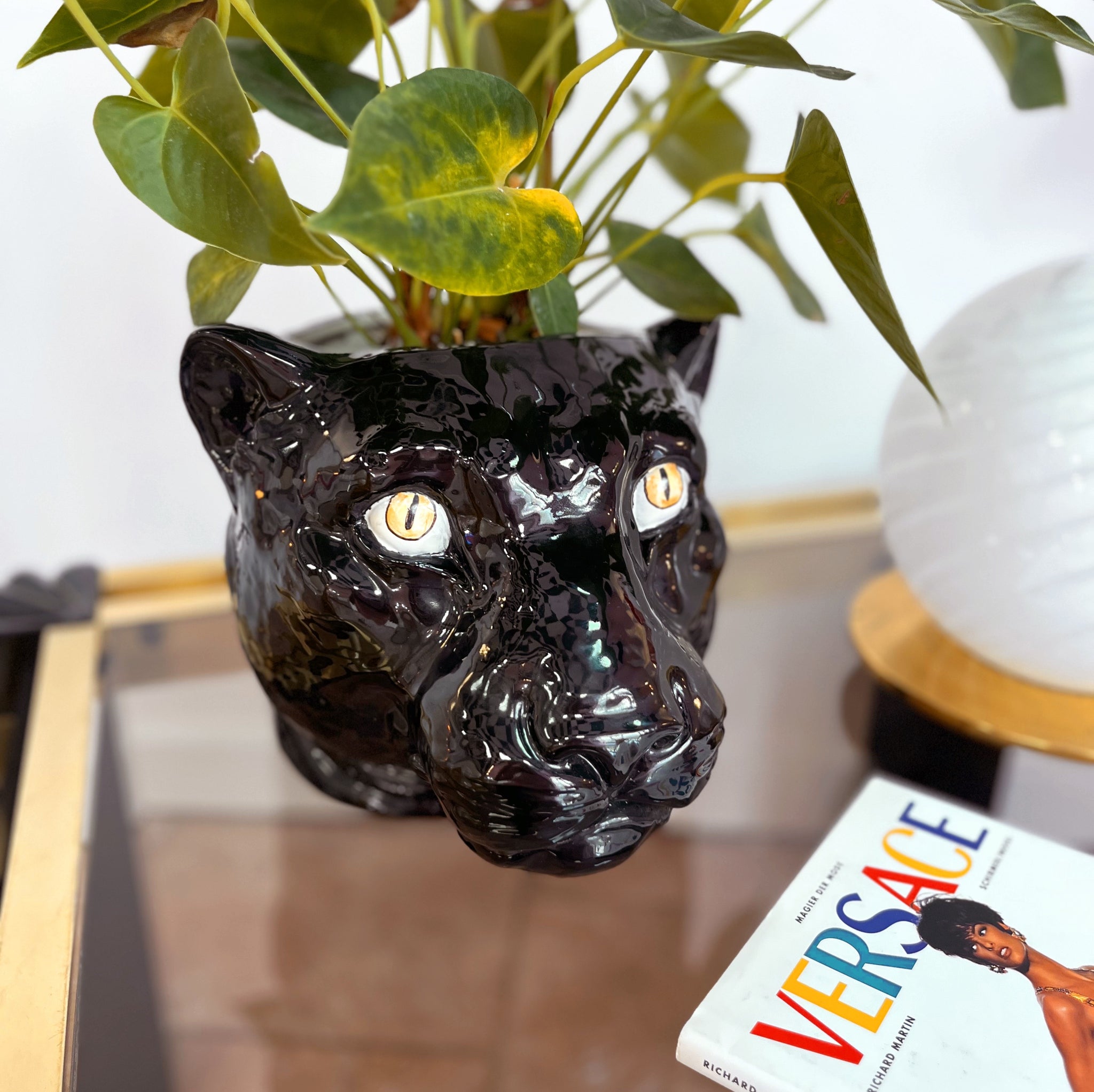 Sublime cache-pot représentant une tête de panthère noire, qui incarne tout l’esprit glamour des années 80 et son obsession pour les félins.