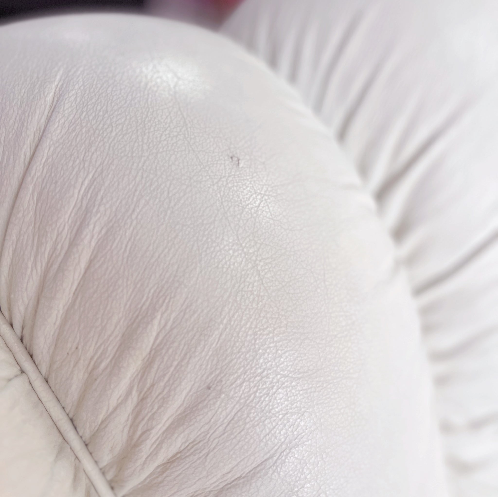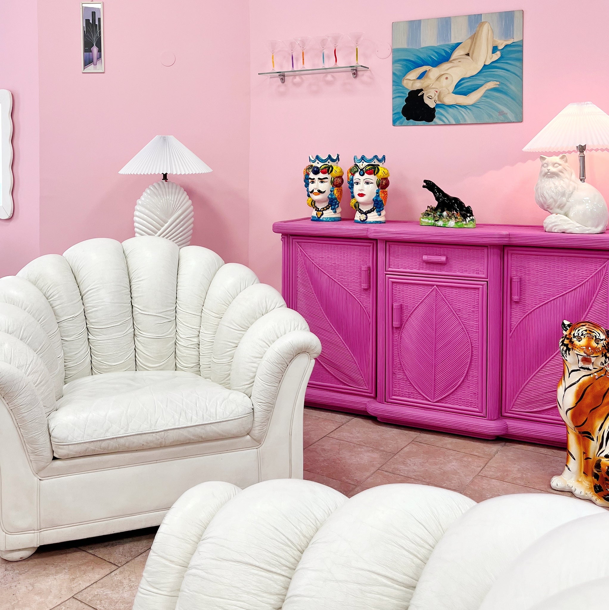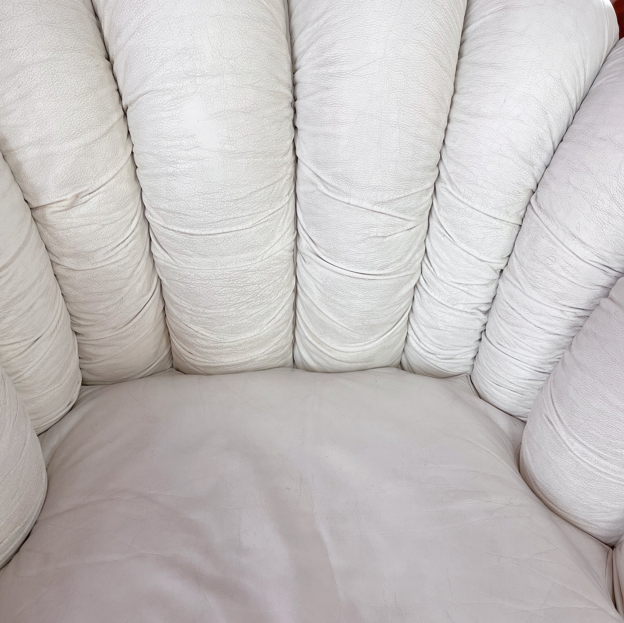 Dans le style des plus beaux salons des penthouses à Miami dans les années 80, cet ensemble canapé et fauteuil évoquant un coquillage voluptueux est disponible dans un magnifique cuir blanc mat, dans lequel on rêve de se lover.