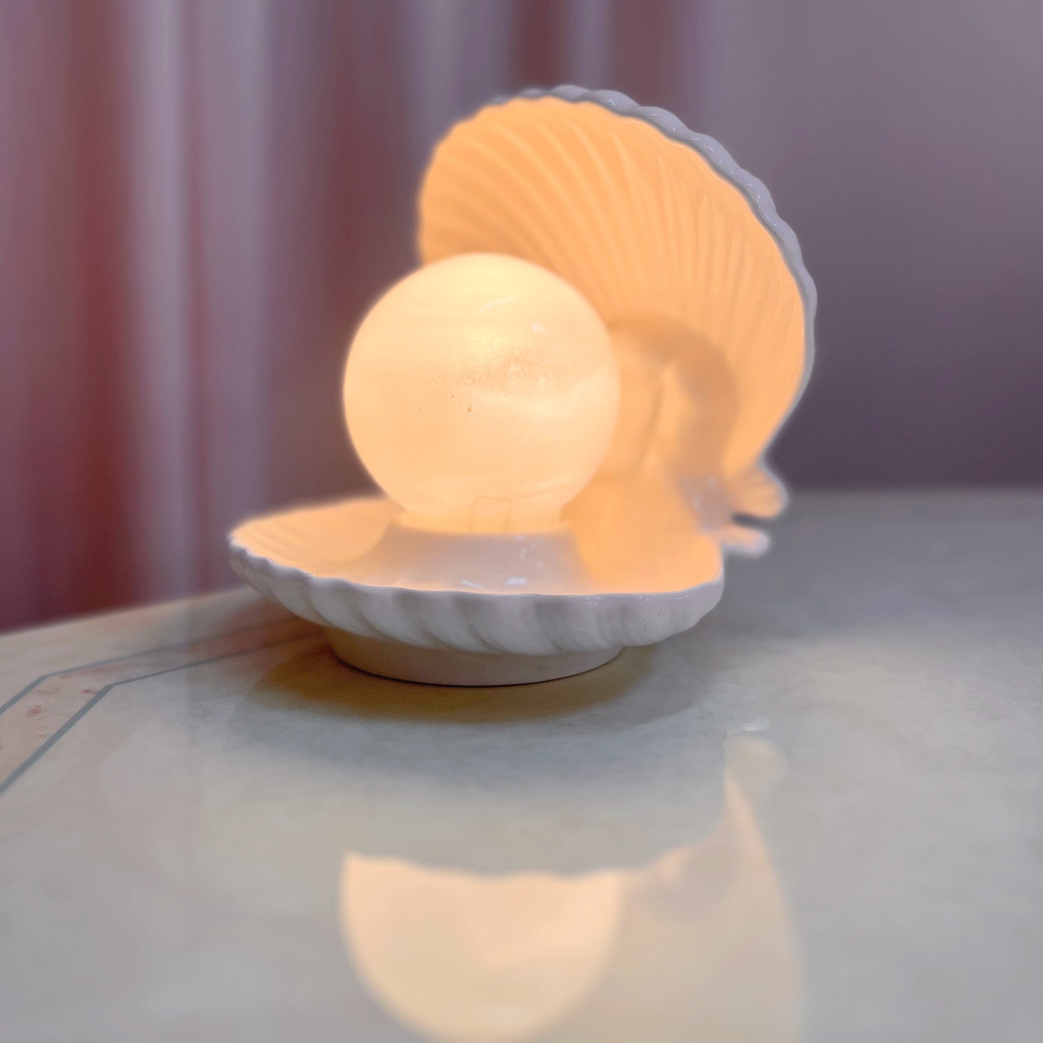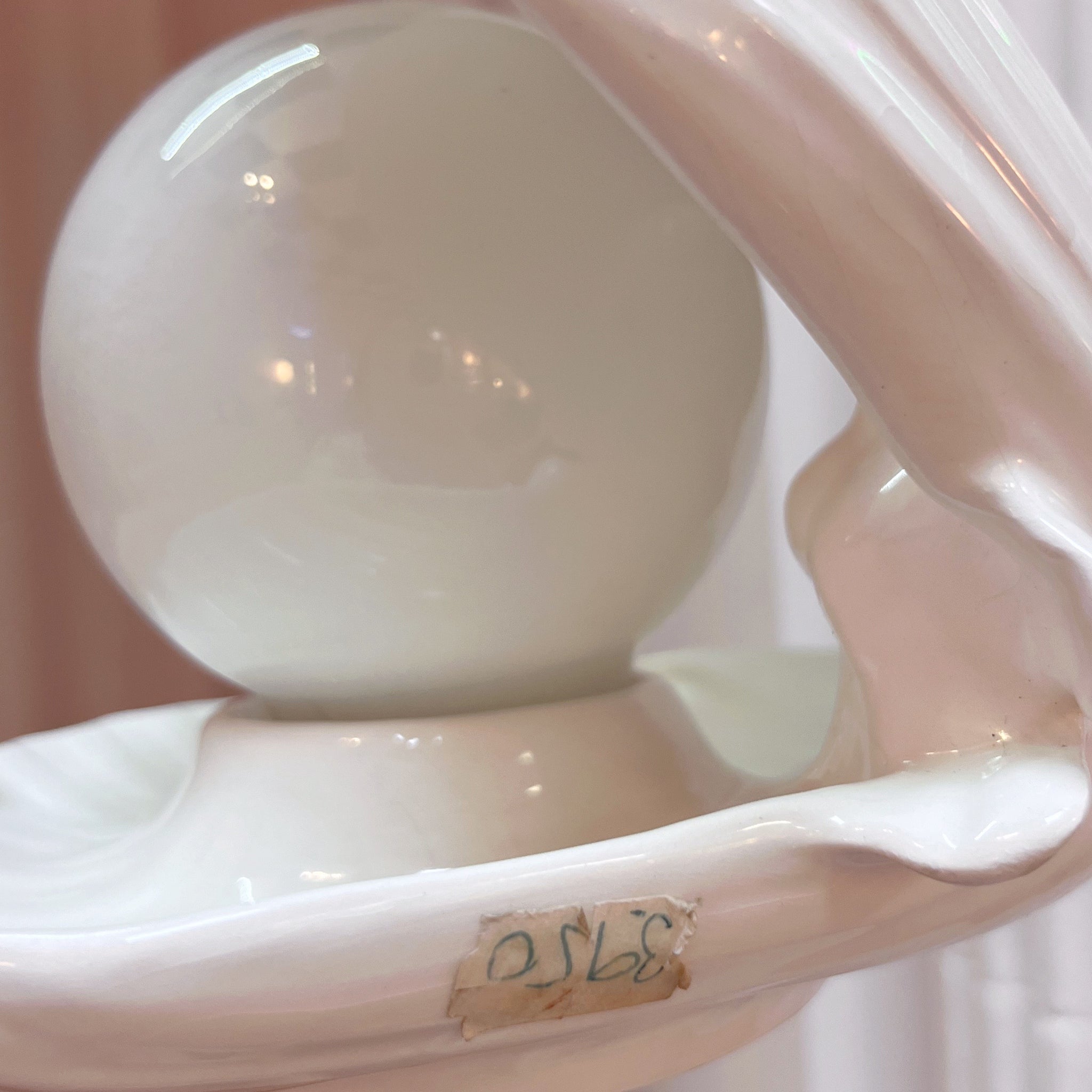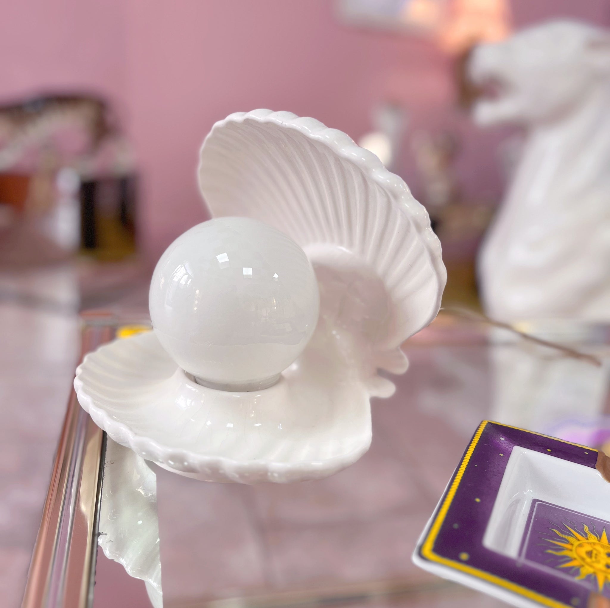 Véritable et précieuse perle de culture nichée dans sa coquille, cette lampe coquillage au charme rare, baignée d’une lueur douce et nacrée, est une pièce emblématique du design Riviera et du chic Palm Beach seventies.