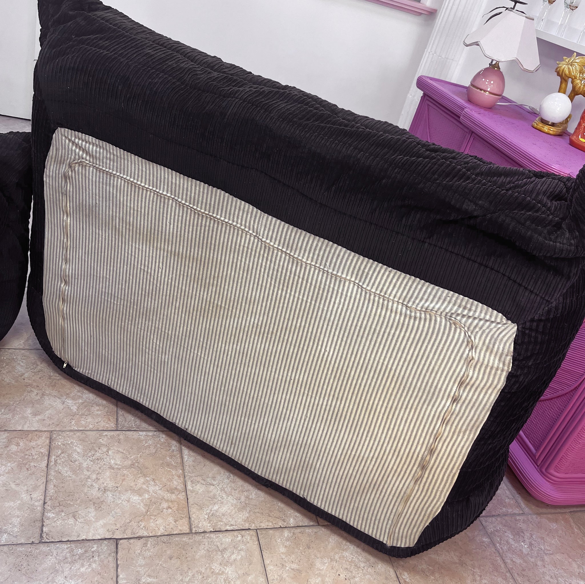 Ensemble Togo Ligne Roset vintage en velours côtelé noir, design Michel Ducaroy, disponible sur Club Barbara