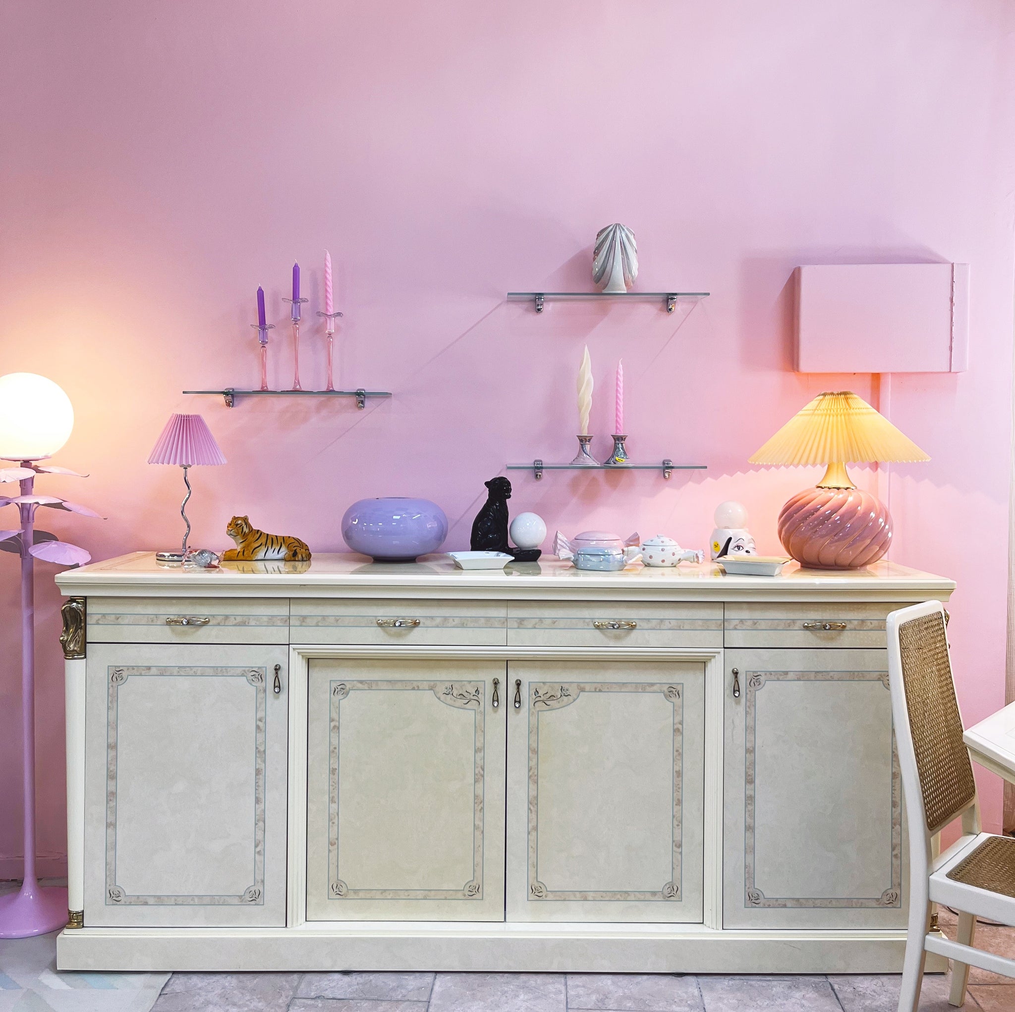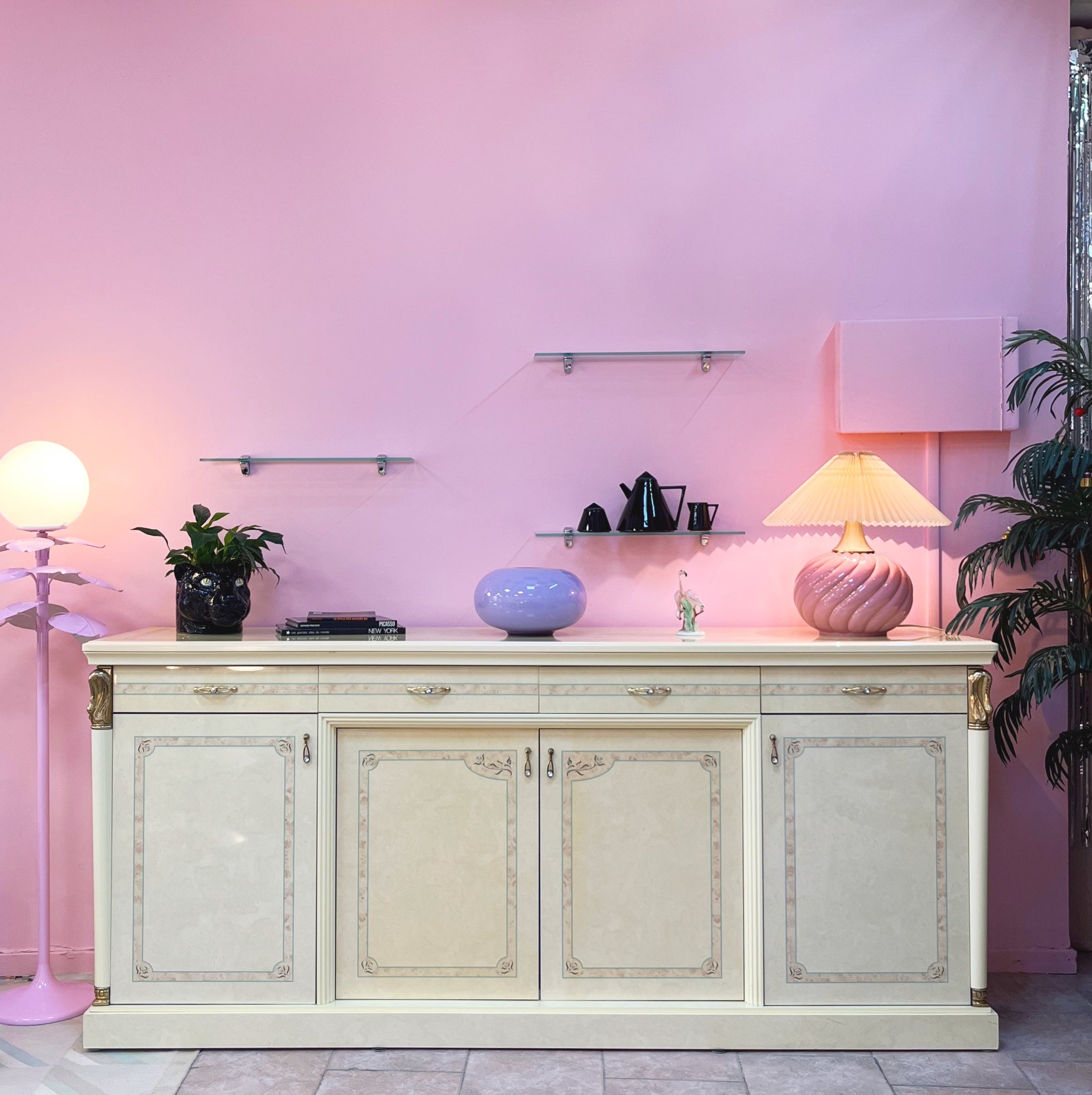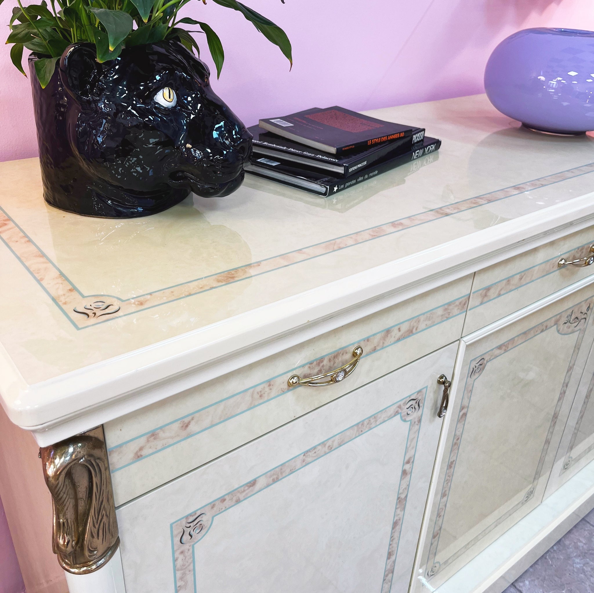 Un buffet spectaculaire dans le plus pur esprit du design italien de la fin des années 70 : ce moment où l’élégance néoclassique se réinventait sous des laques lumineuses et des lignes géométriques.