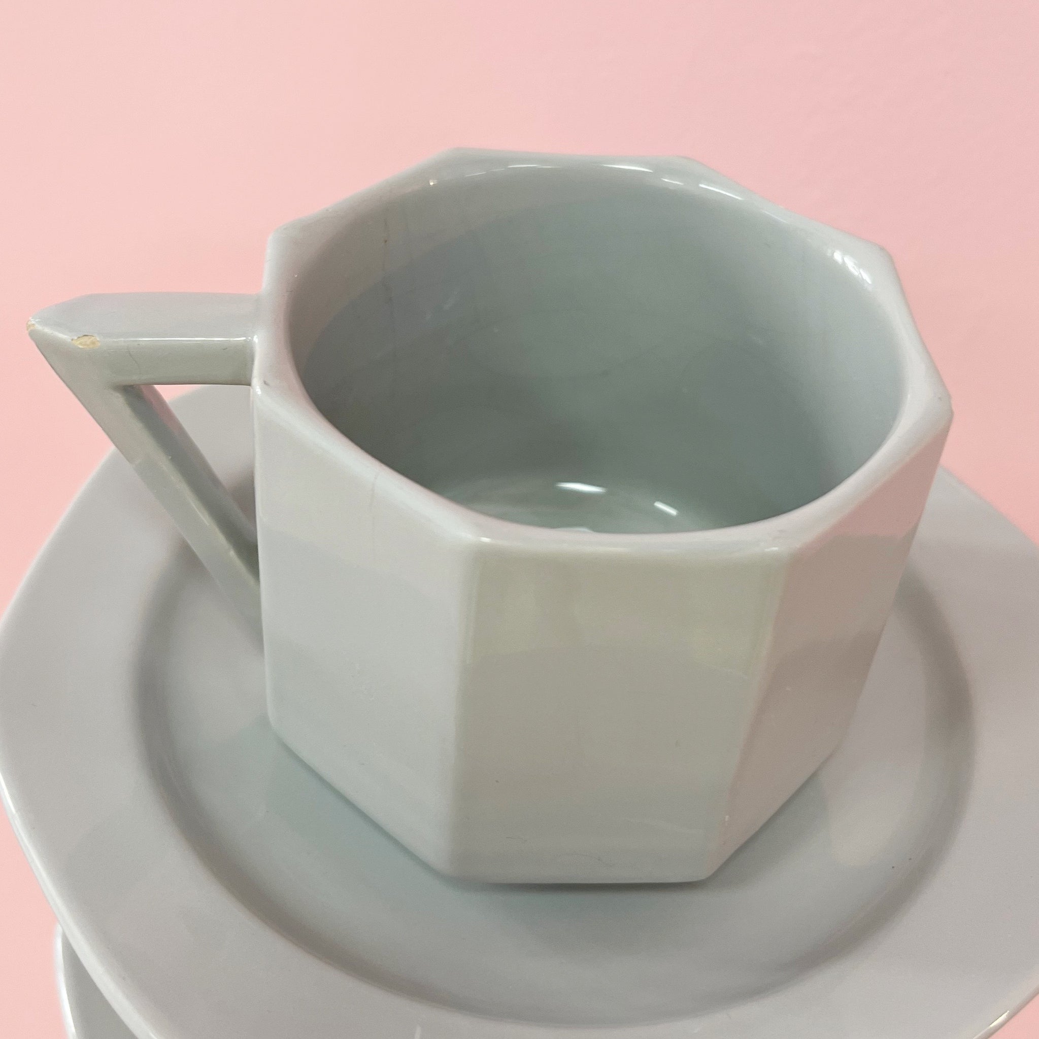 Joli duo de grandes tasses et leurs sous-tasses années 80 de forme octogonales gris clair. On adore les volumes iconiques so eighties pour un petit déjeuner retro-chic en amoureux.