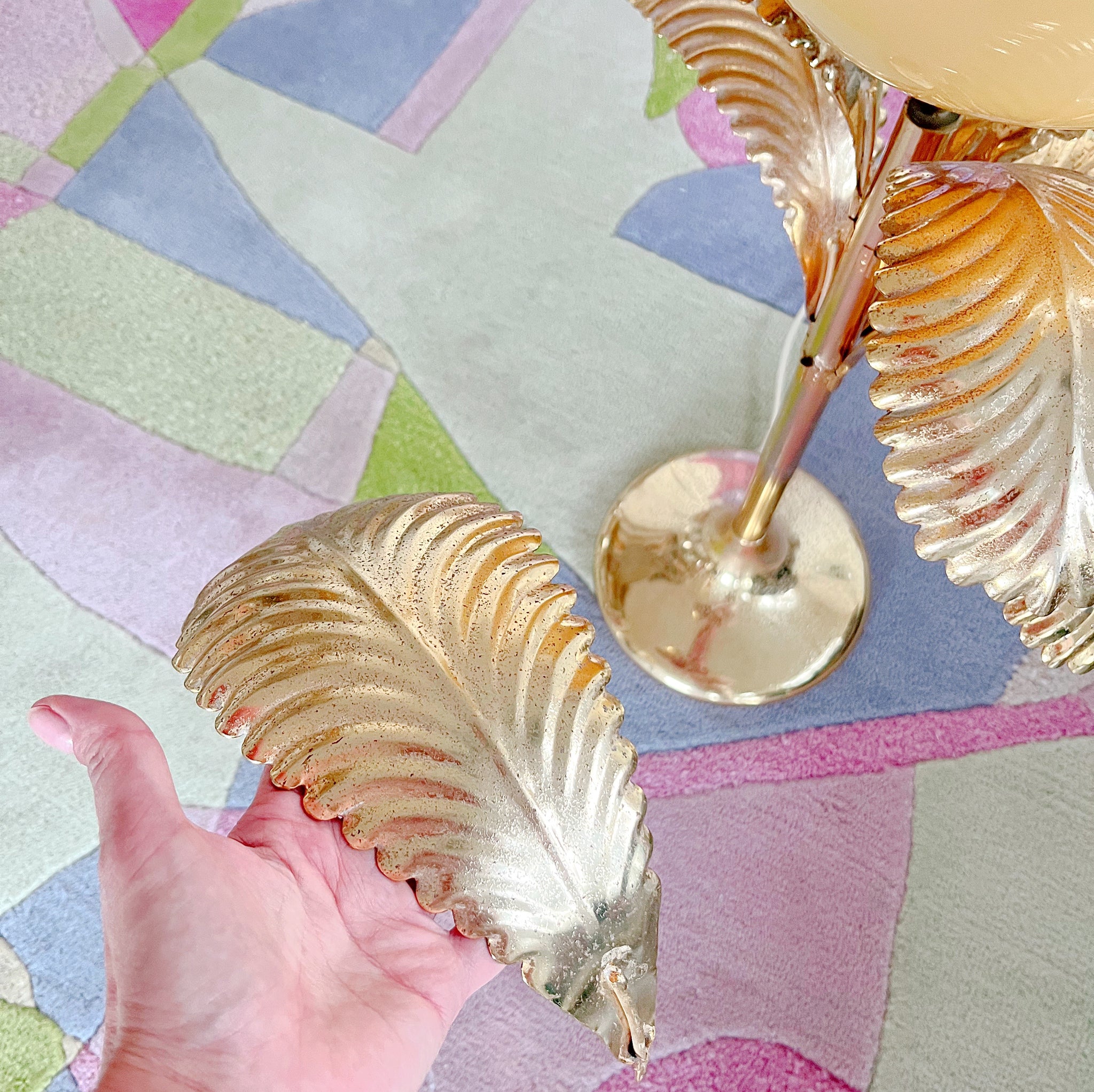 Sublime lampadaire en laiton Golden Palm Tree des années 70-80 de fabrication italienne. Ce luminaire exceptionnel de style Hollywood Regency est un objet qui enchantera une pièce par sa taille et sa prestance. Ses 12 grandes et délicates feuilles dorées sont amovibles, ce qui facilite le transport. Son magnifique globe opalin jaune éclaire son environnement d'une couleur douce comme un coucher de soleil.