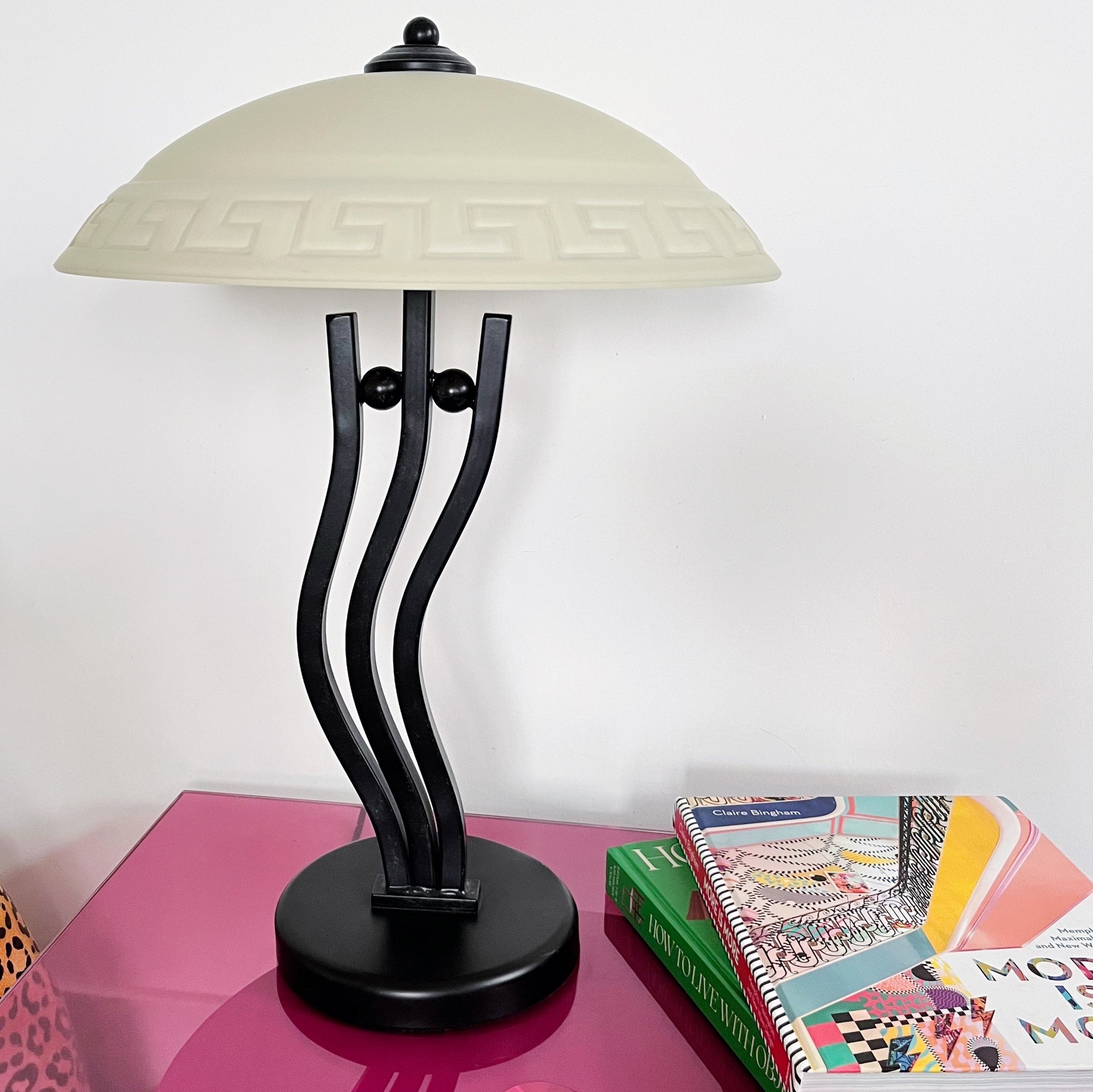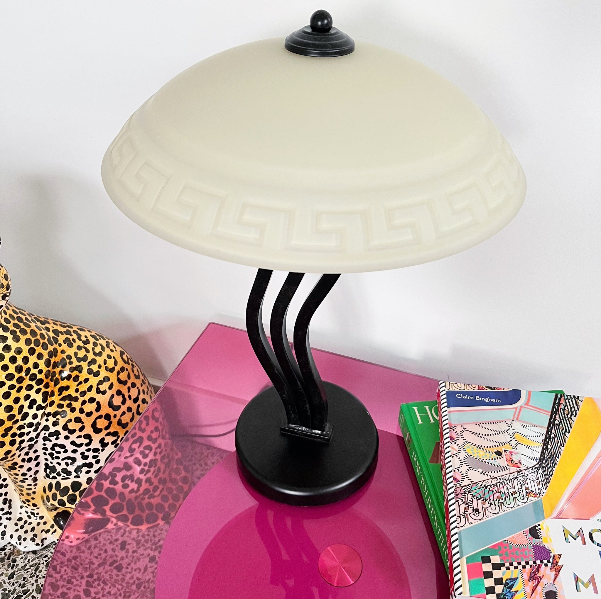 On adore cette pièce ultra design grand format pour un intérieur post-moderne iconique. Le pied de lampe est en métal massif surmonté d'une pièce en verre dépoli ciselée d'ornements art déco.