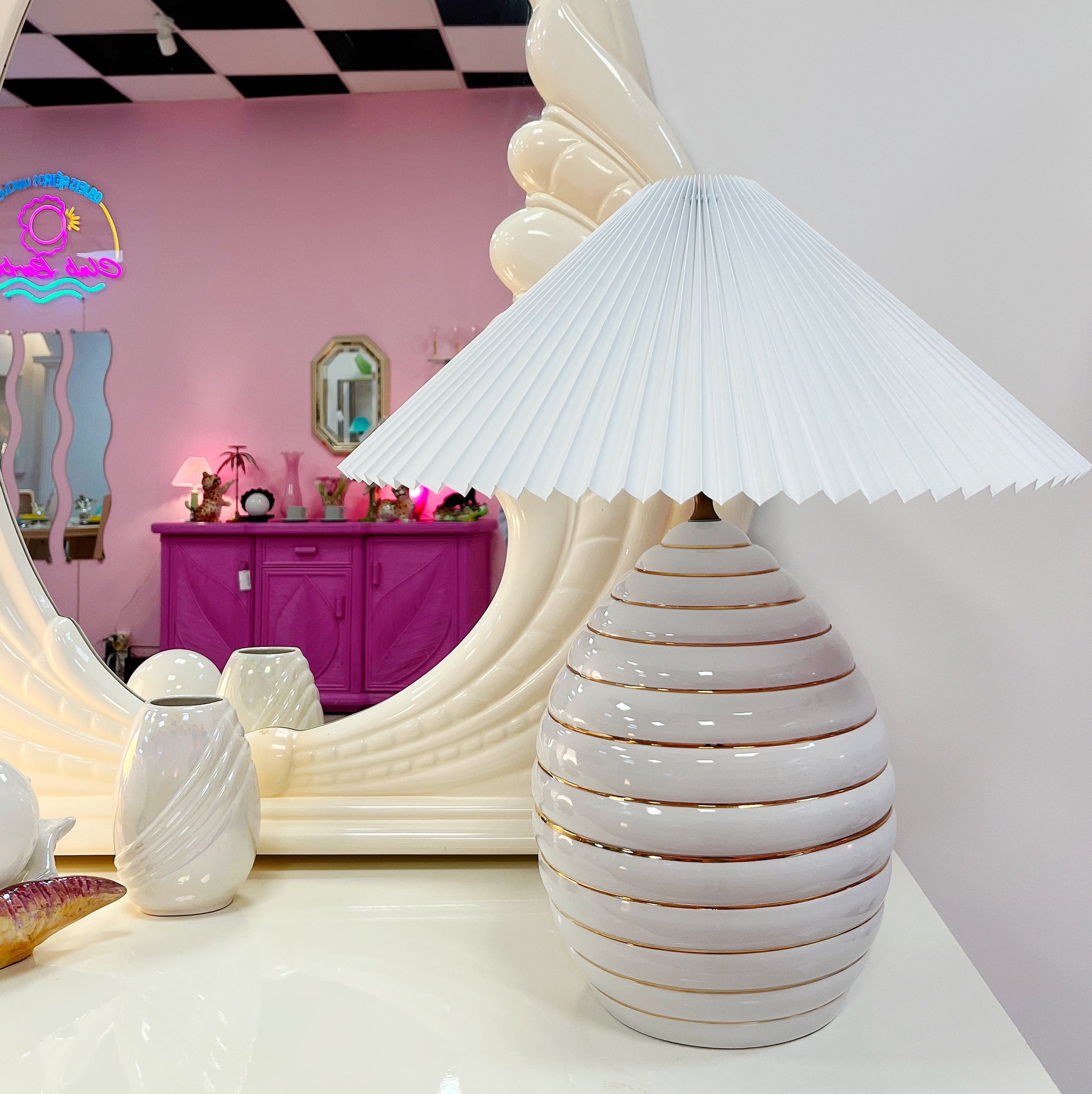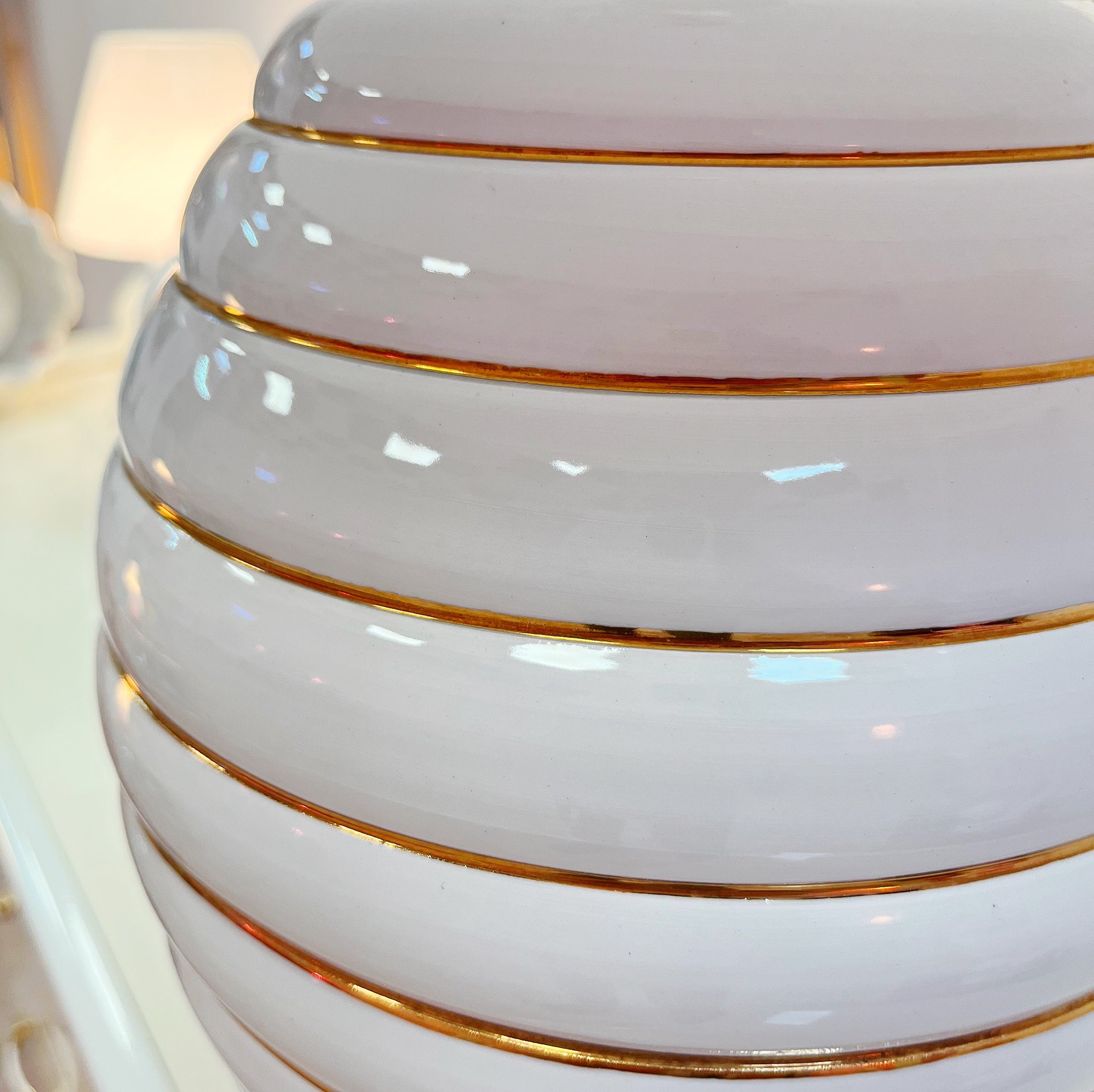 Splendide grande lampe vintage des années 70-80 made in Italy, dans le style du designer Tommaso Barbi. Le pied est en ceramique blanche émaillée dont les volumes courbés sont décorées de superbes liserais dorés.