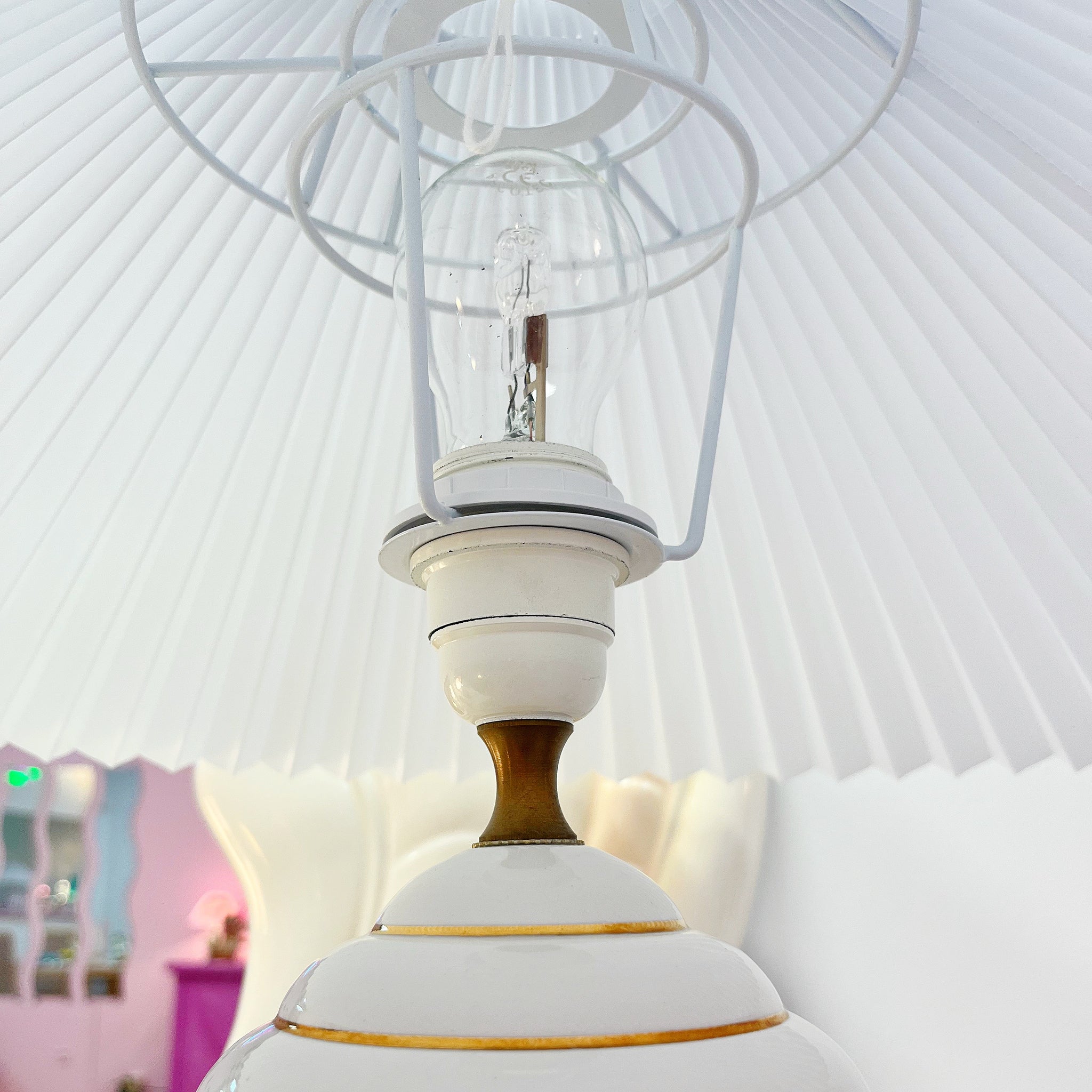 La tige intérieure et la douille d’origine sont en métal doré de grande qualité. L’abat jour plissé blanc et sa structure en métal ne sont pas d’origine.