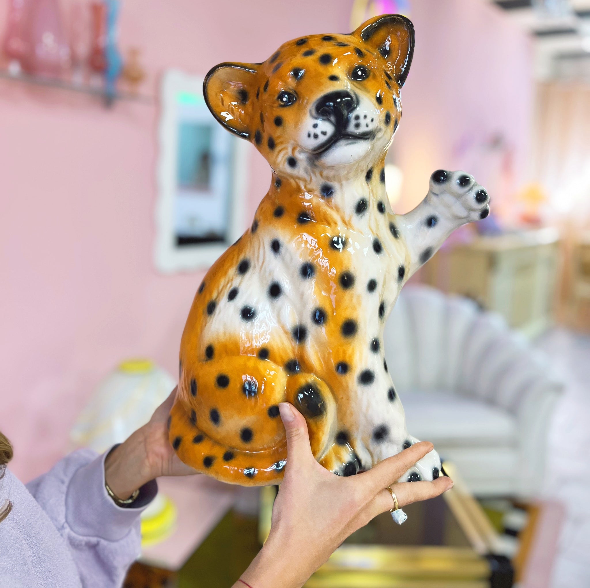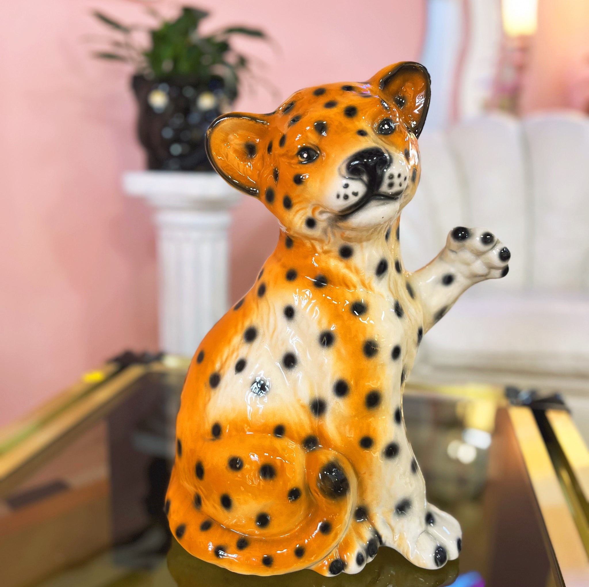 Avec ses 43 cm de haut et 30 cm de large, ce modèle à la taille intermédiaire, rare dans ces dimensions, est la pièce parfaite pour une touche exotique sobre. Sa robe fauve ponctuée de taches noires, son regard malicieux et sa patte levée lui confèrent une allure graphique, typique du design animalier glamour des décennies 70-80.