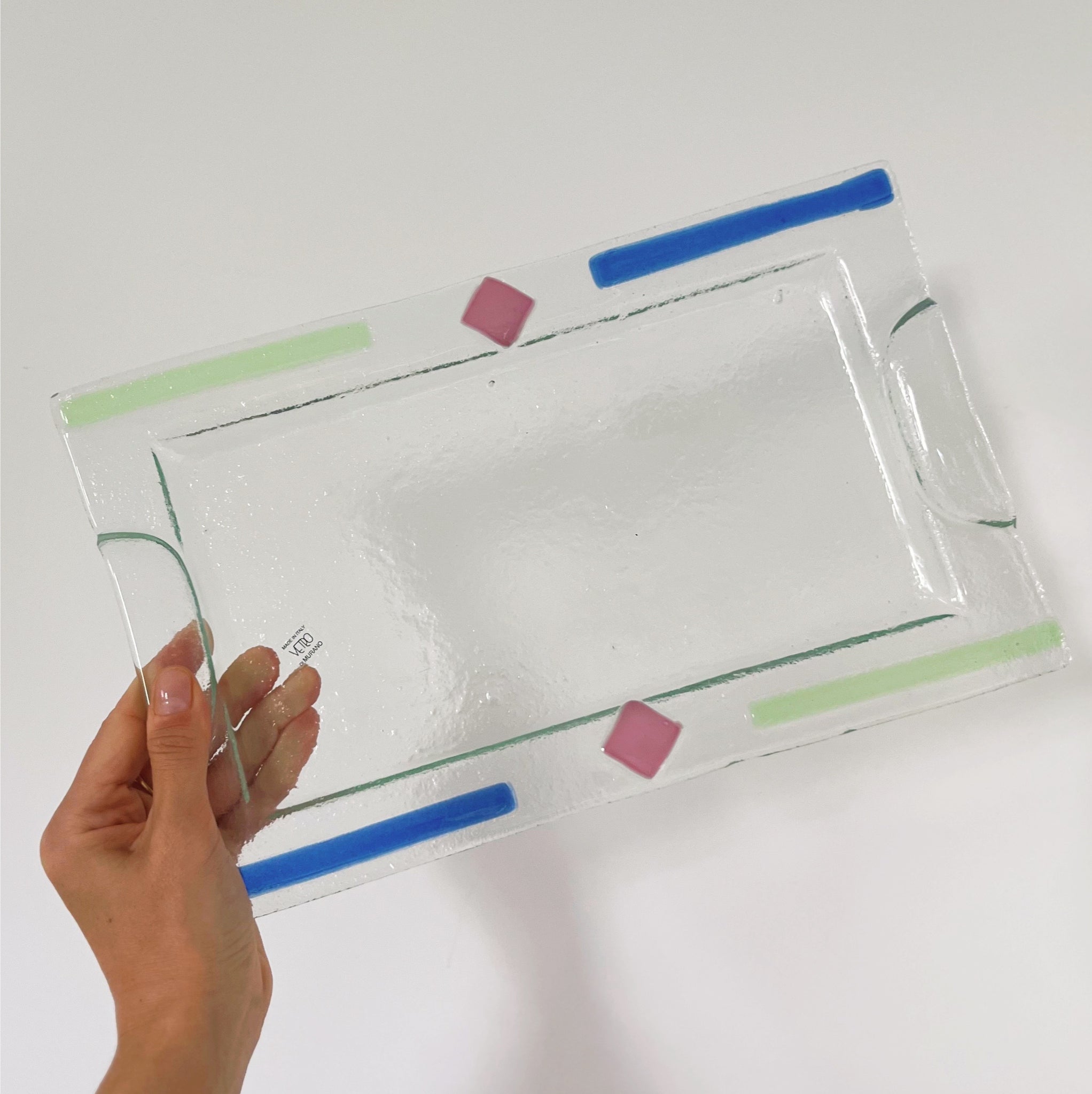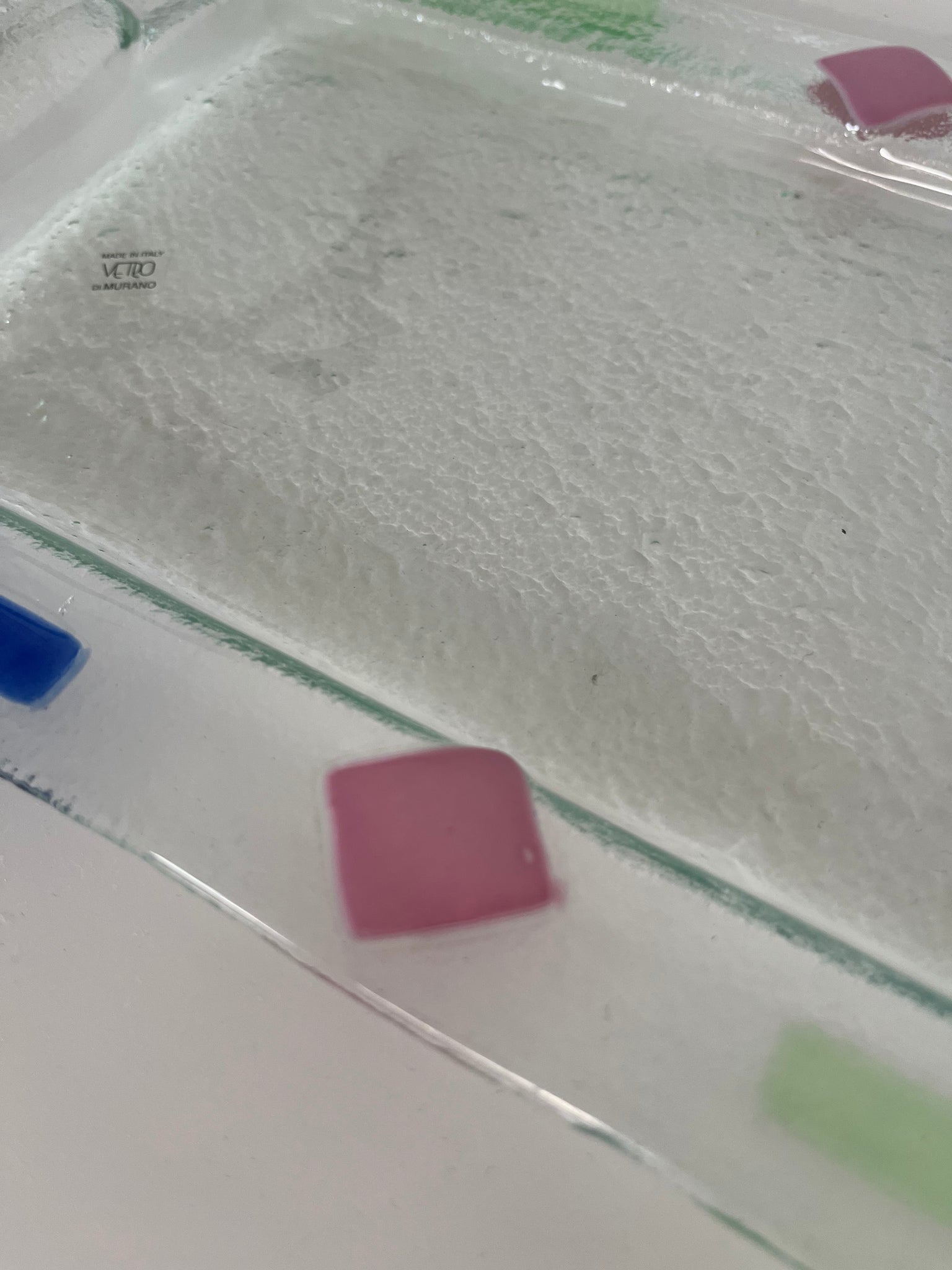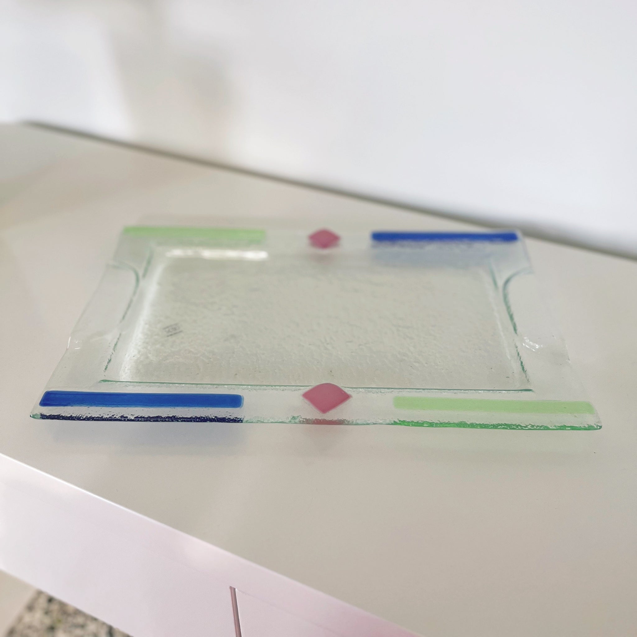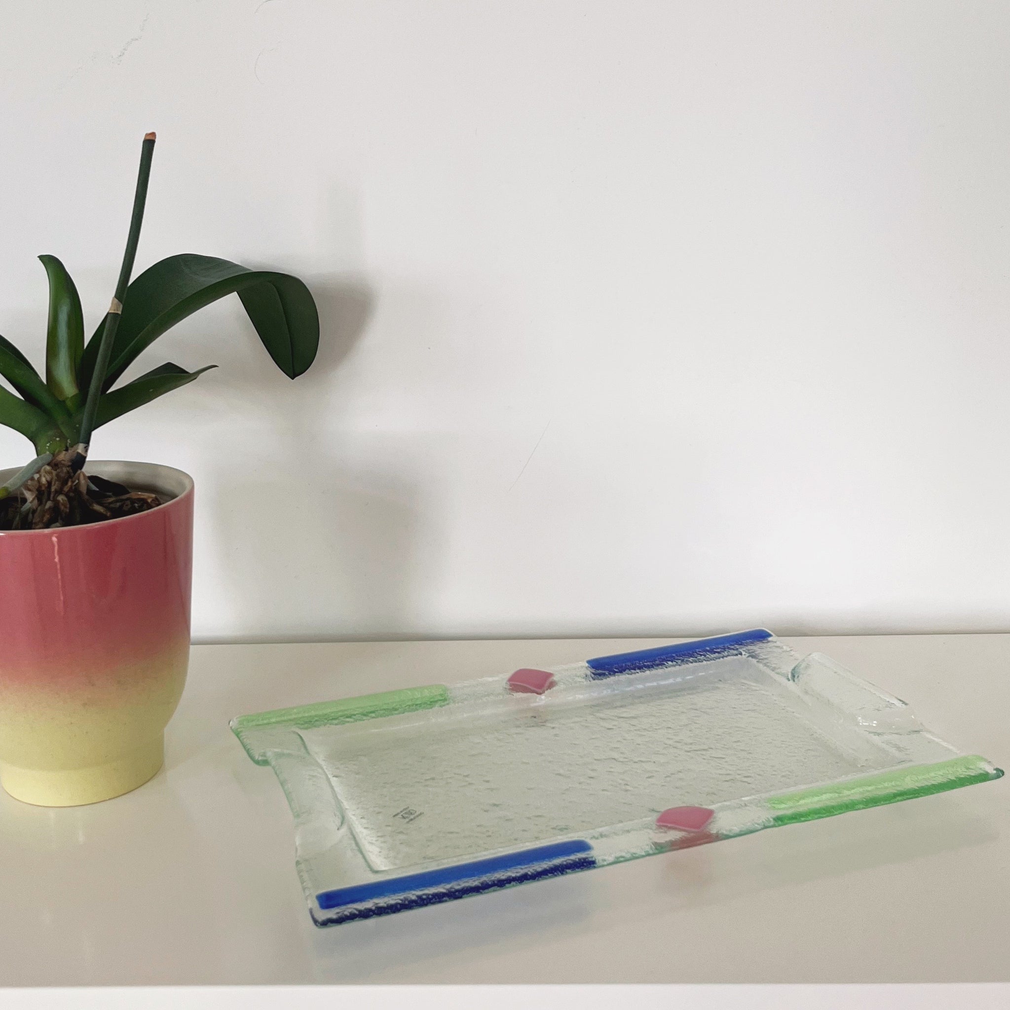 Pièce rare en verre de Murano fabriquée en Italie dans les années 70 et attribuée à la verrerie Albatros, connue pour ses créations modernistes en verre soufflé colorées. Le plateau associe un pourtour en verre lisse transparent à une surface centrale en verre texturé, souvent désignée comme verre granité ou sablé, créant un effet de lumière délicat et diffus. Les appliques en verre coloré, bleu profond, rose framboise, vert translucide, évoquent déjà les jeux chromatiques et les contrastes graphiques avant-gardistes du mouvement Memphis Design, alliant géométrie et couleur.