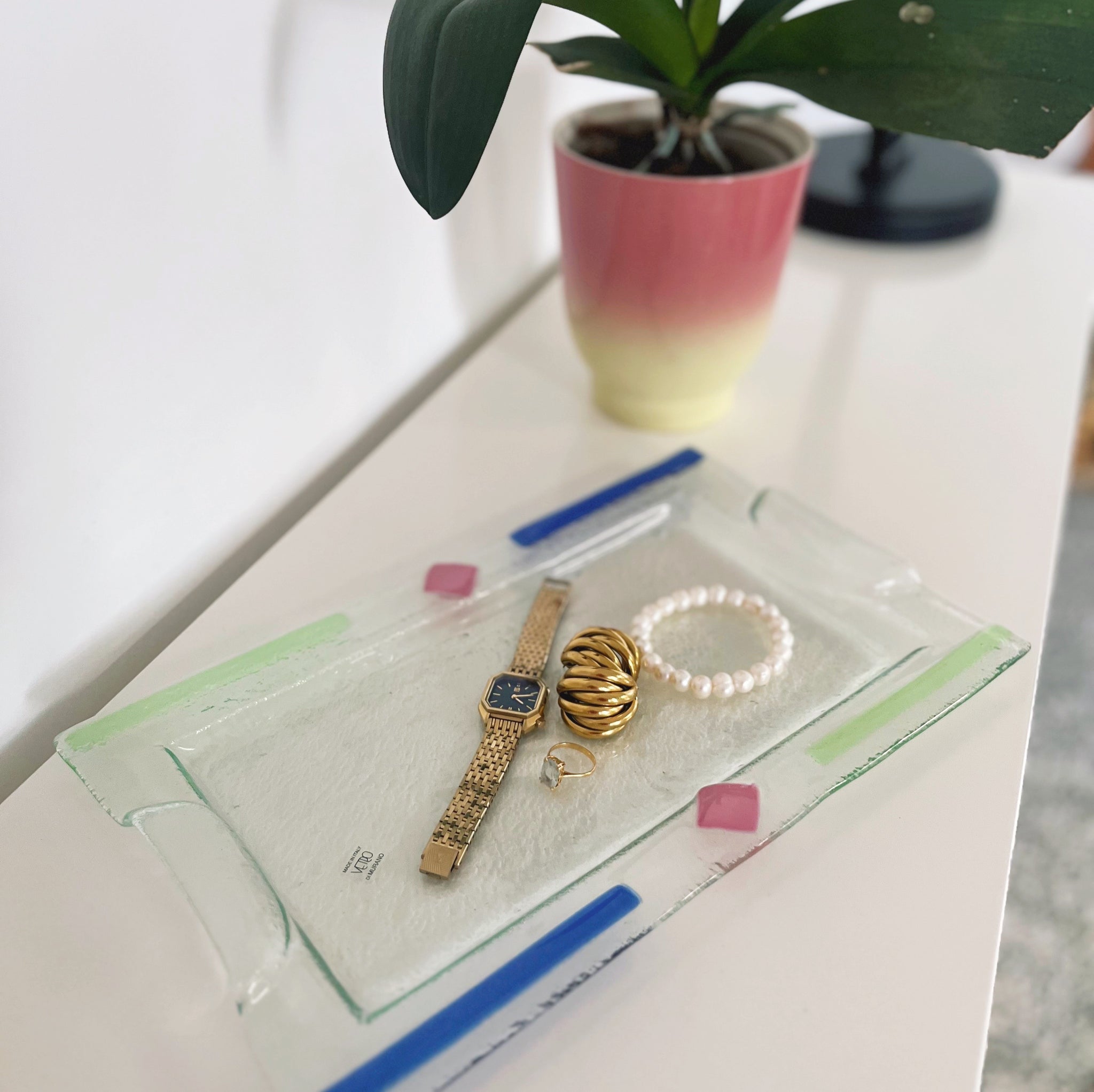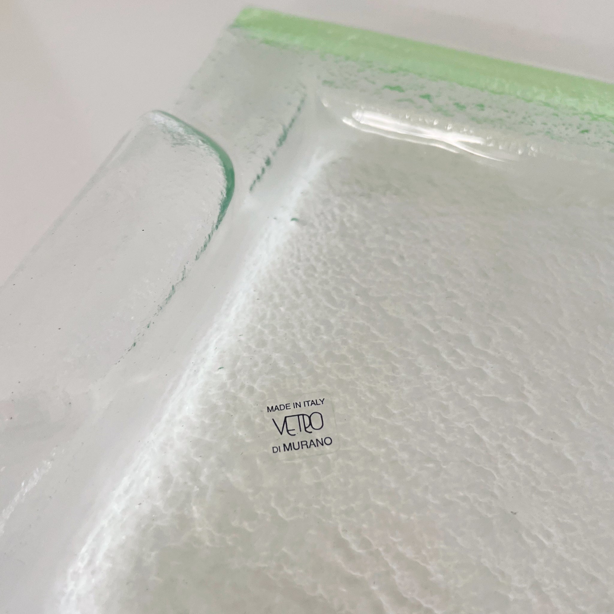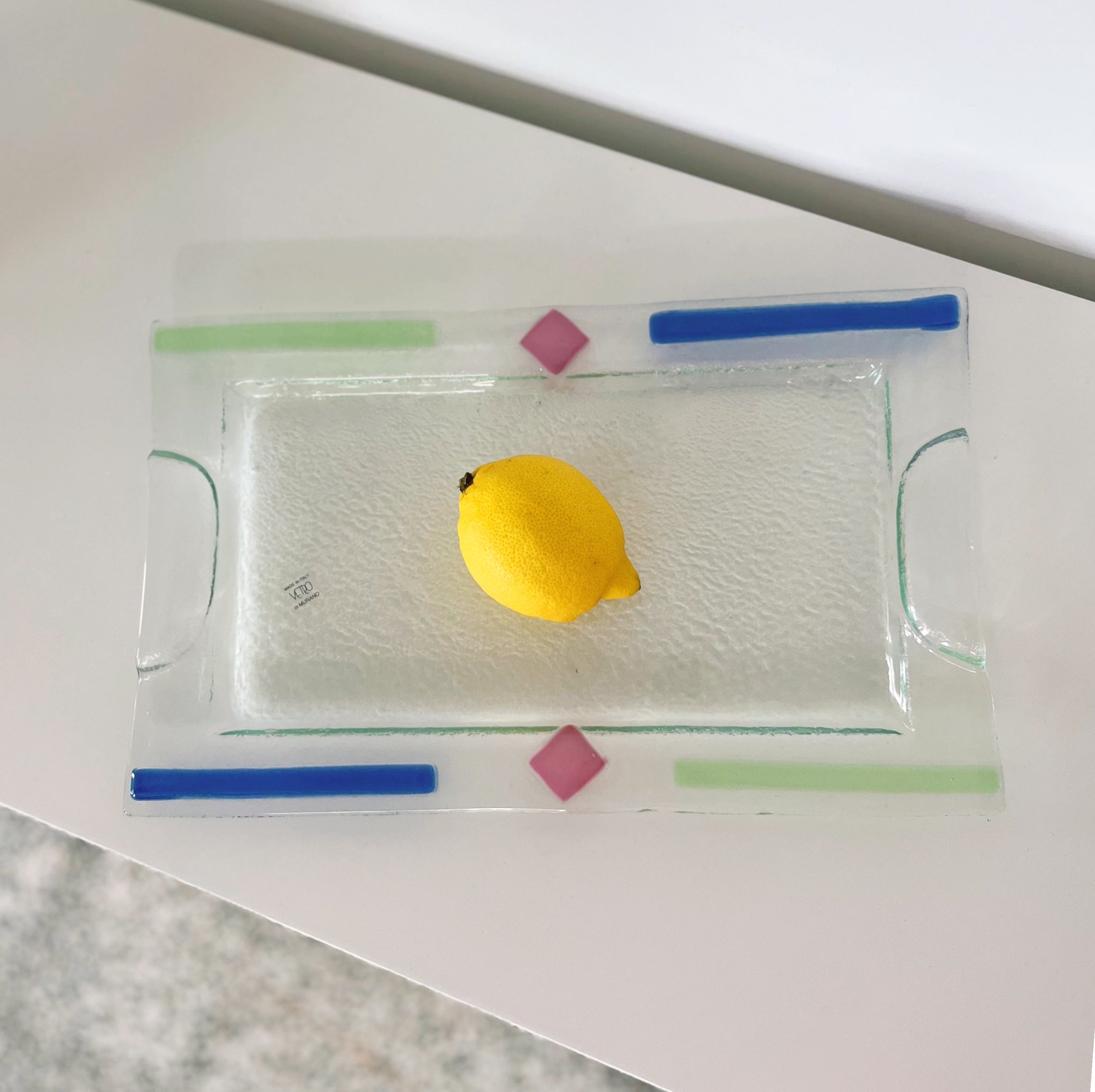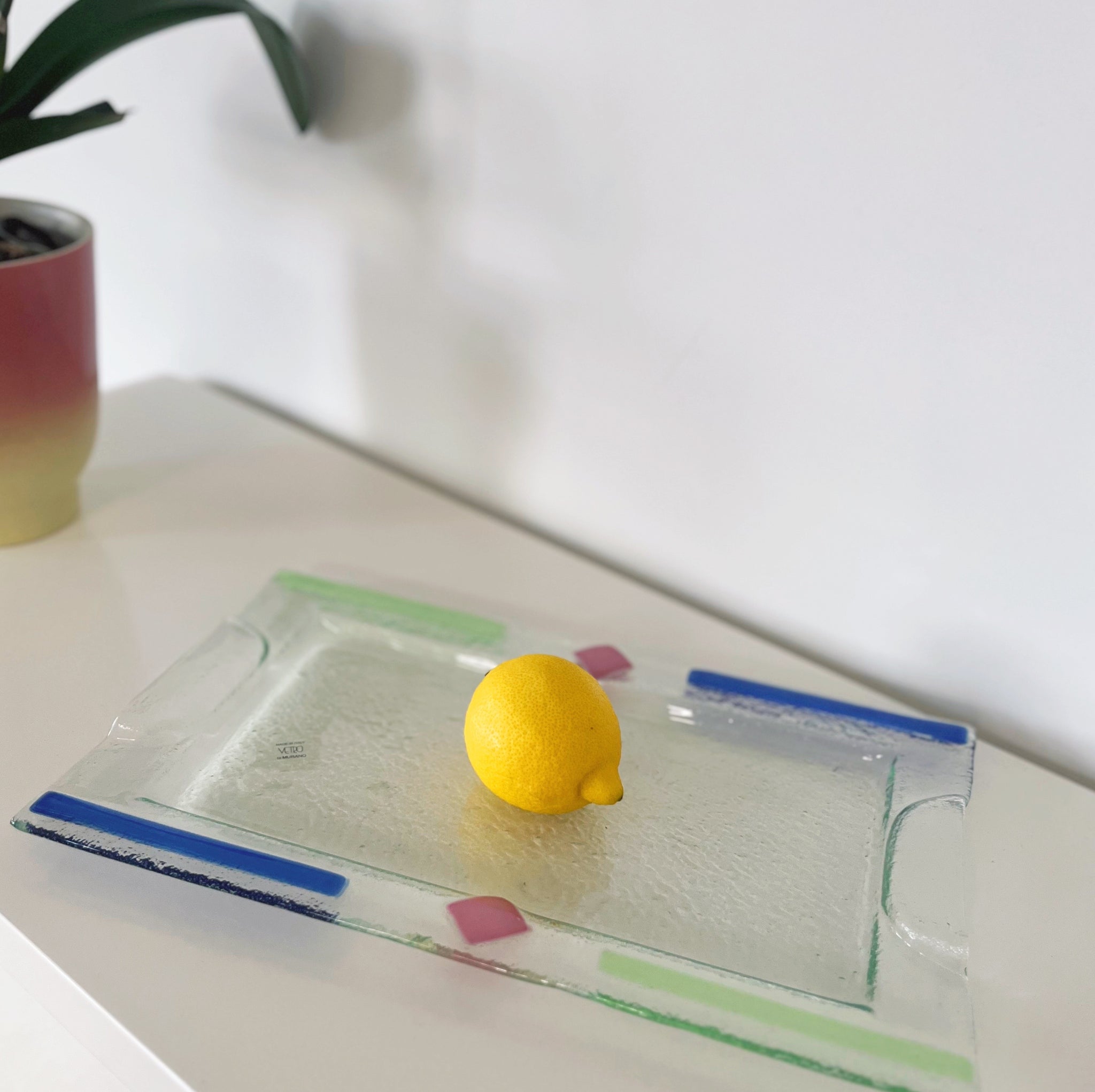 Pièce rare en verre de Murano fabriquée en Italie dans les années 70 et attribuée à la verrerie Albatros, connue pour ses créations modernistes en verre soufflé colorées. Le plateau associe un pourtour en verre lisse transparent à une surface centrale en verre texturé, souvent désignée comme verre granité ou sablé, créant un effet de lumière délicat et diffus. Les appliques en verre coloré, bleu profond, rose framboise, vert translucide, évoquent déjà les jeux chromatiques et les contrastes graphiques avant-gardistes du mouvement Memphis Design, alliant géométrie et couleur.