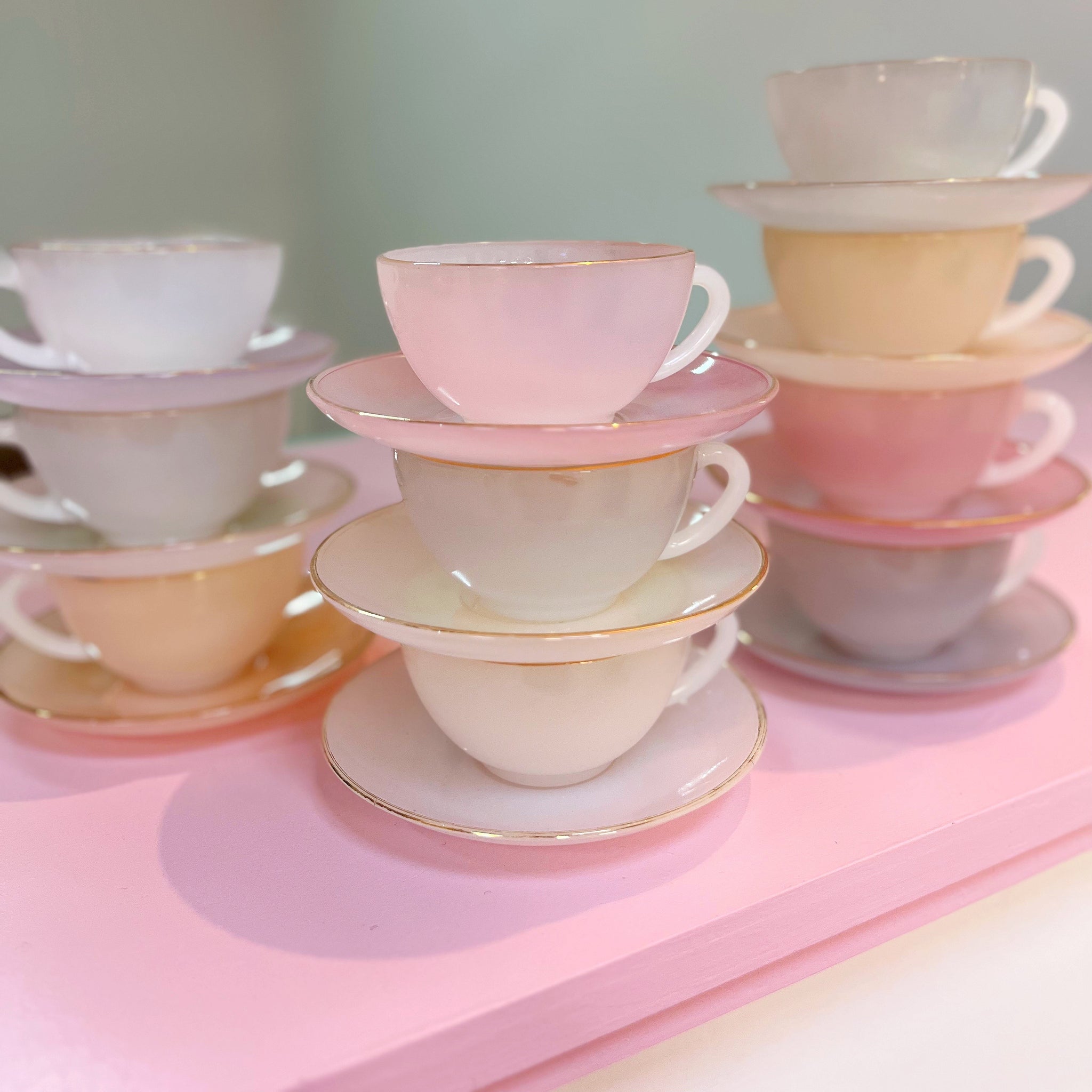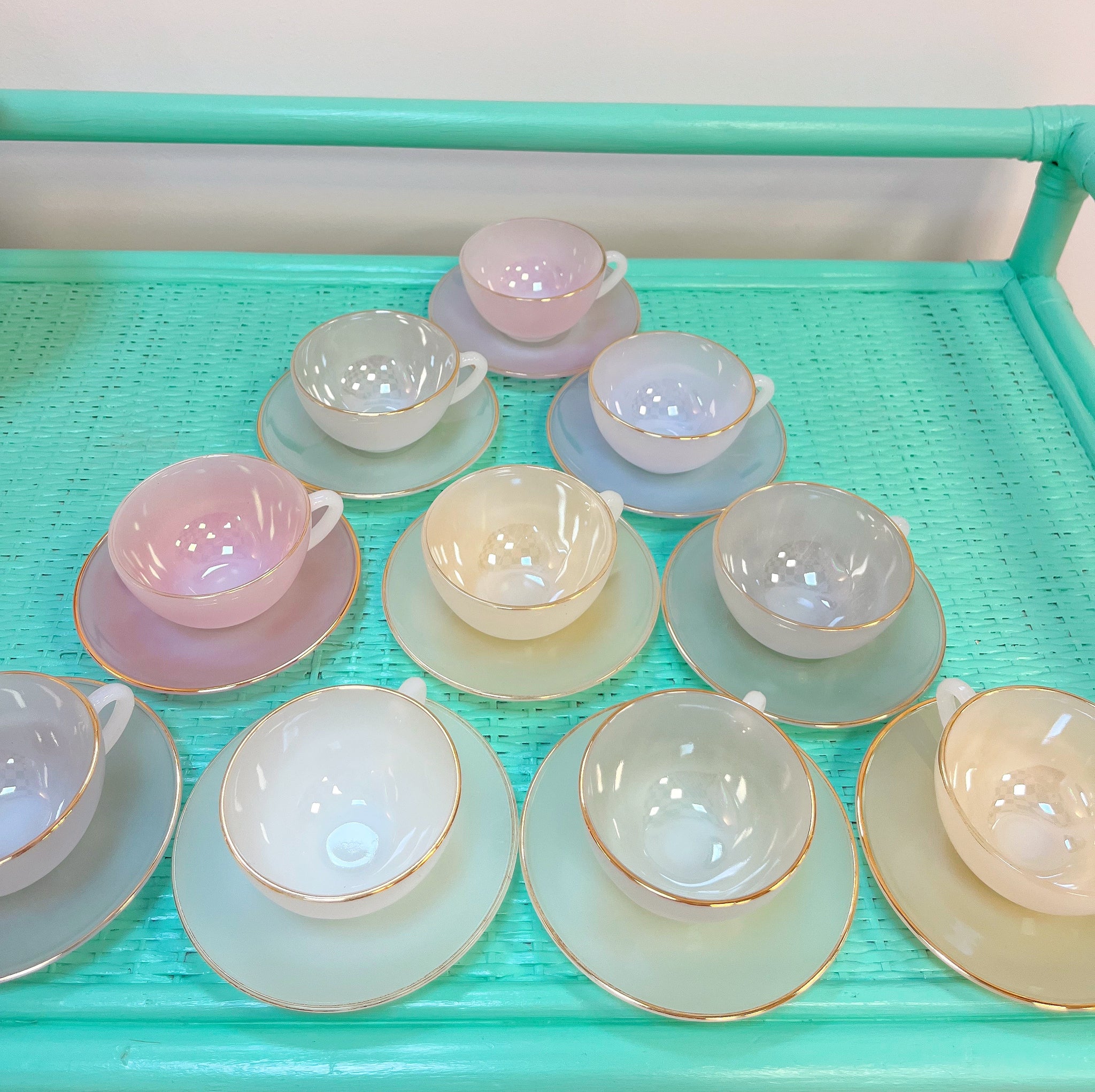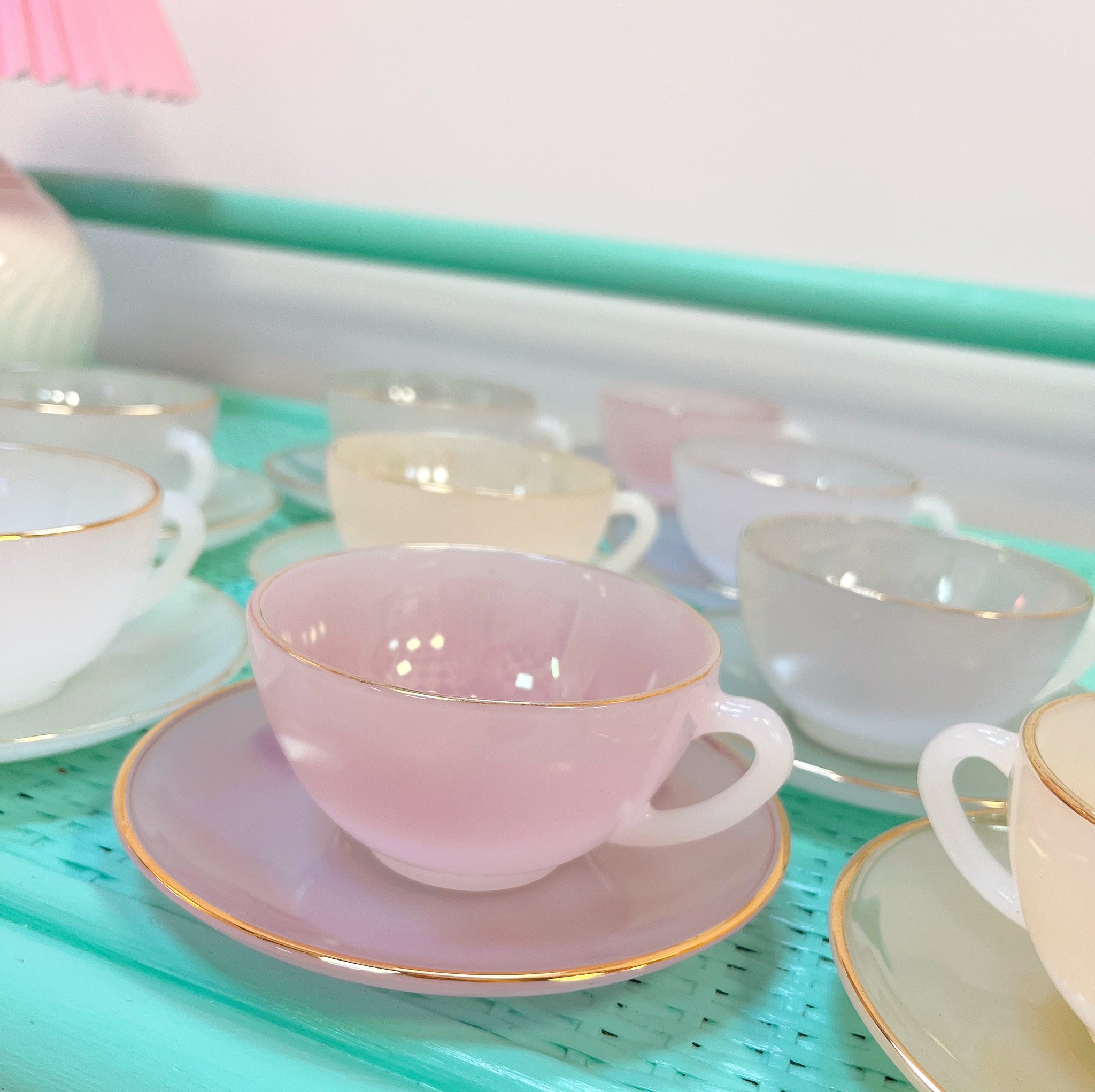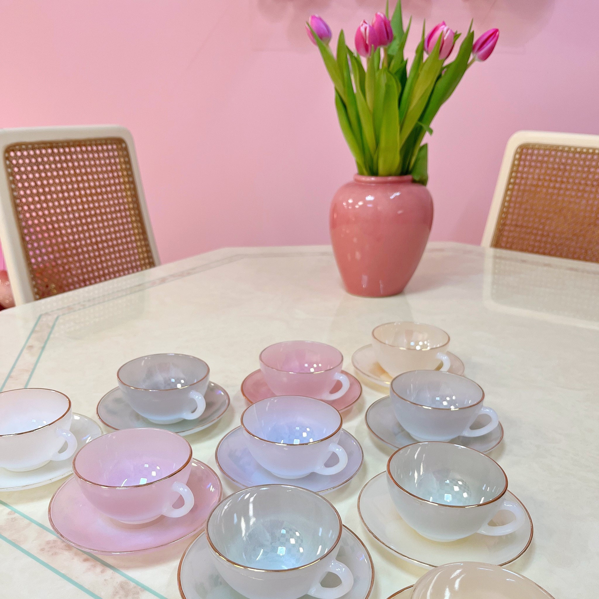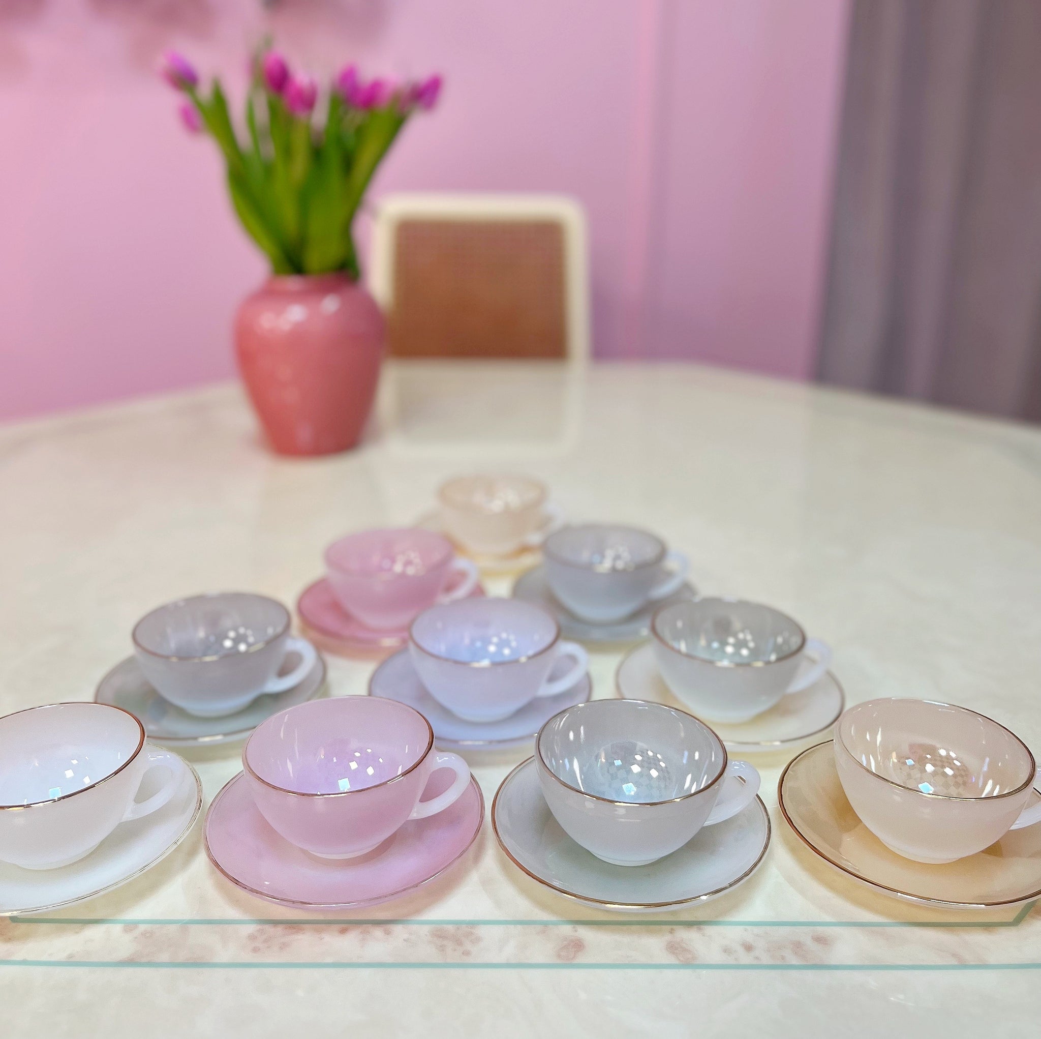 Splendide et iconiques service à café Arlequin pastel signé Arcopal, daté des années 60 : une pièce rare et délicieusement chic.