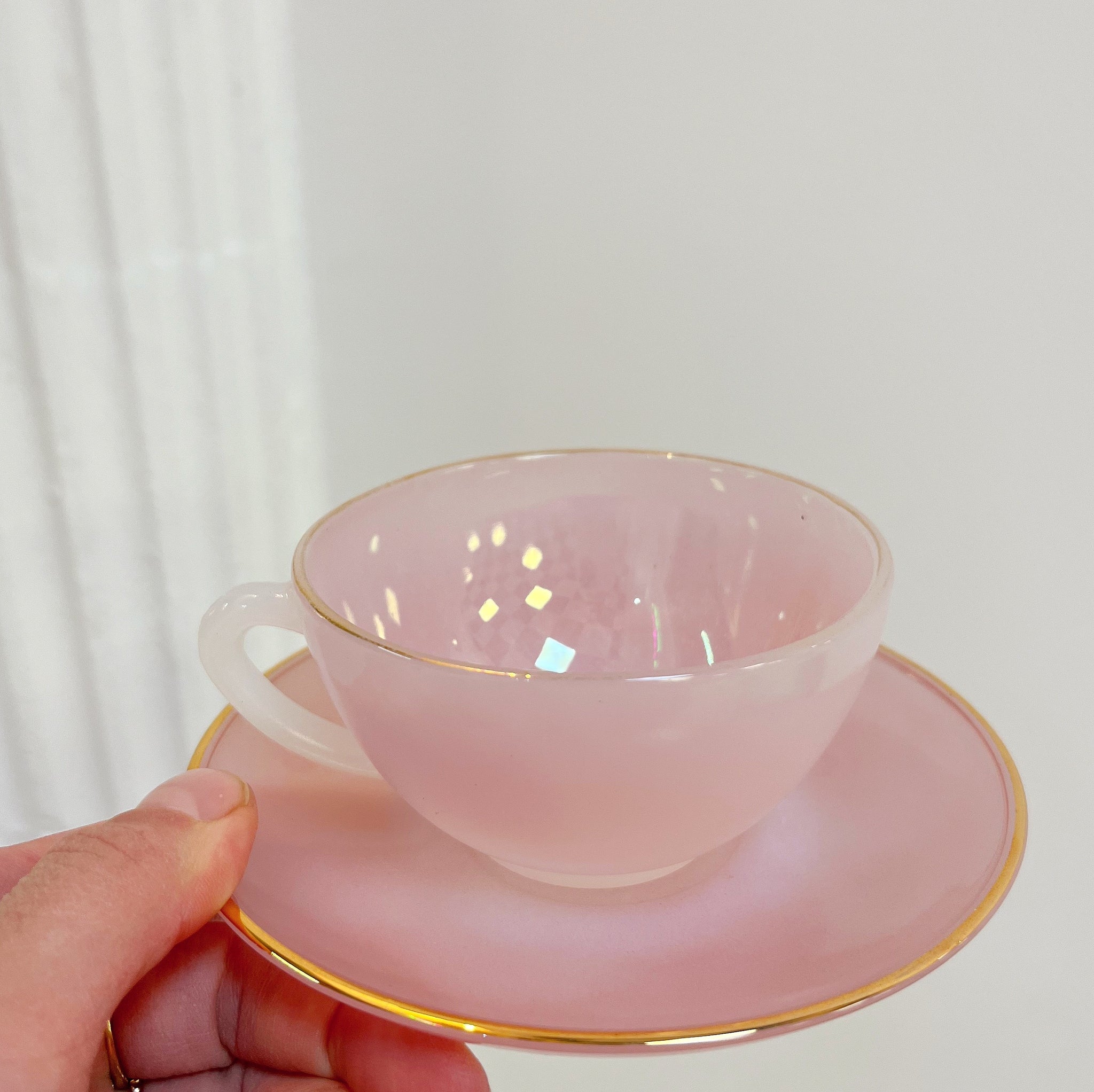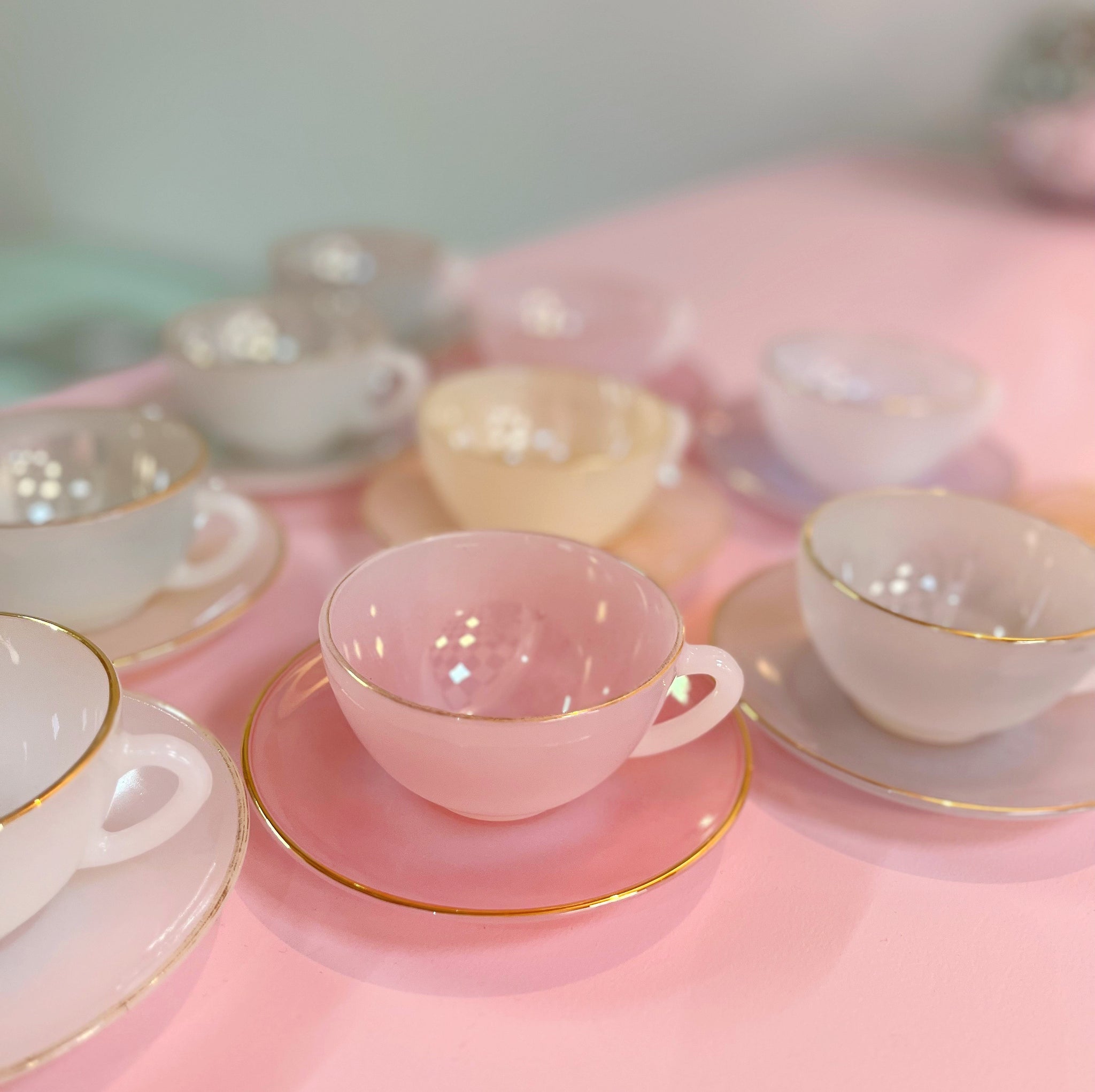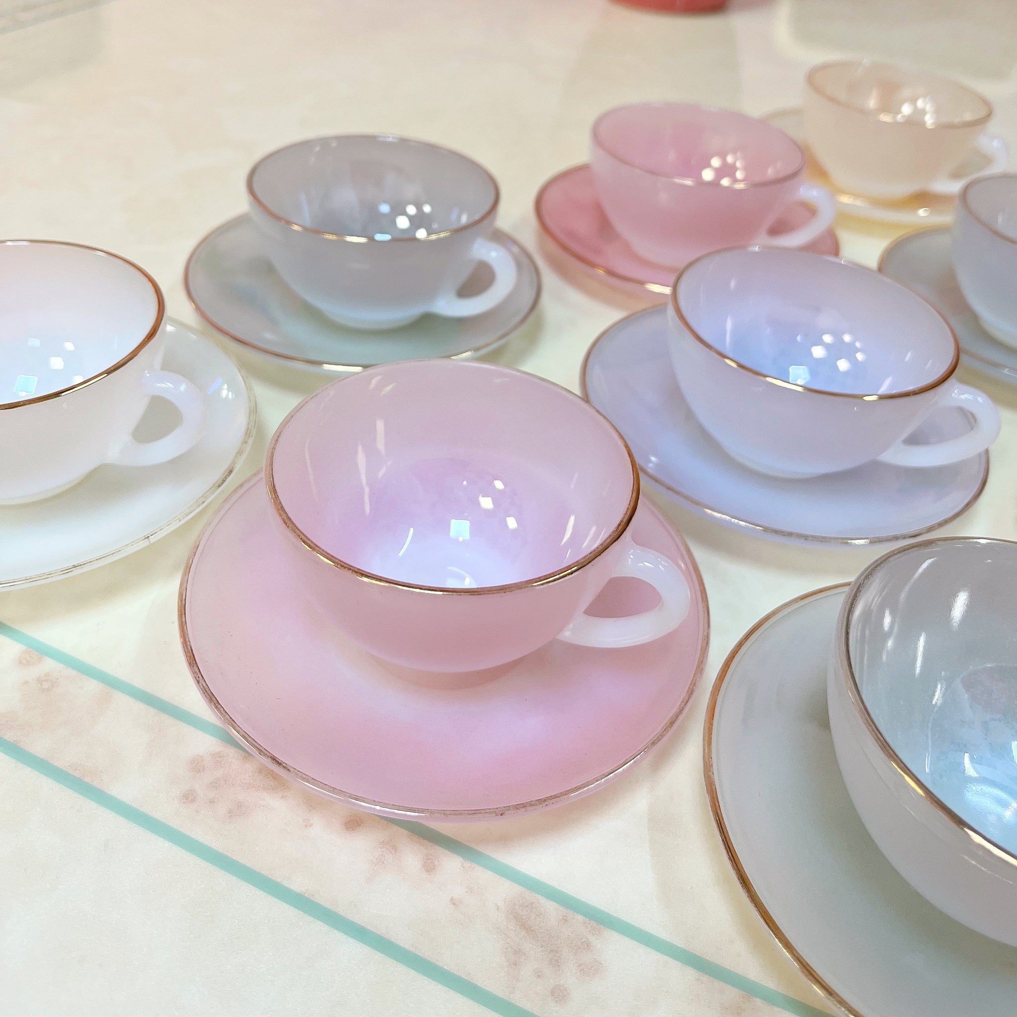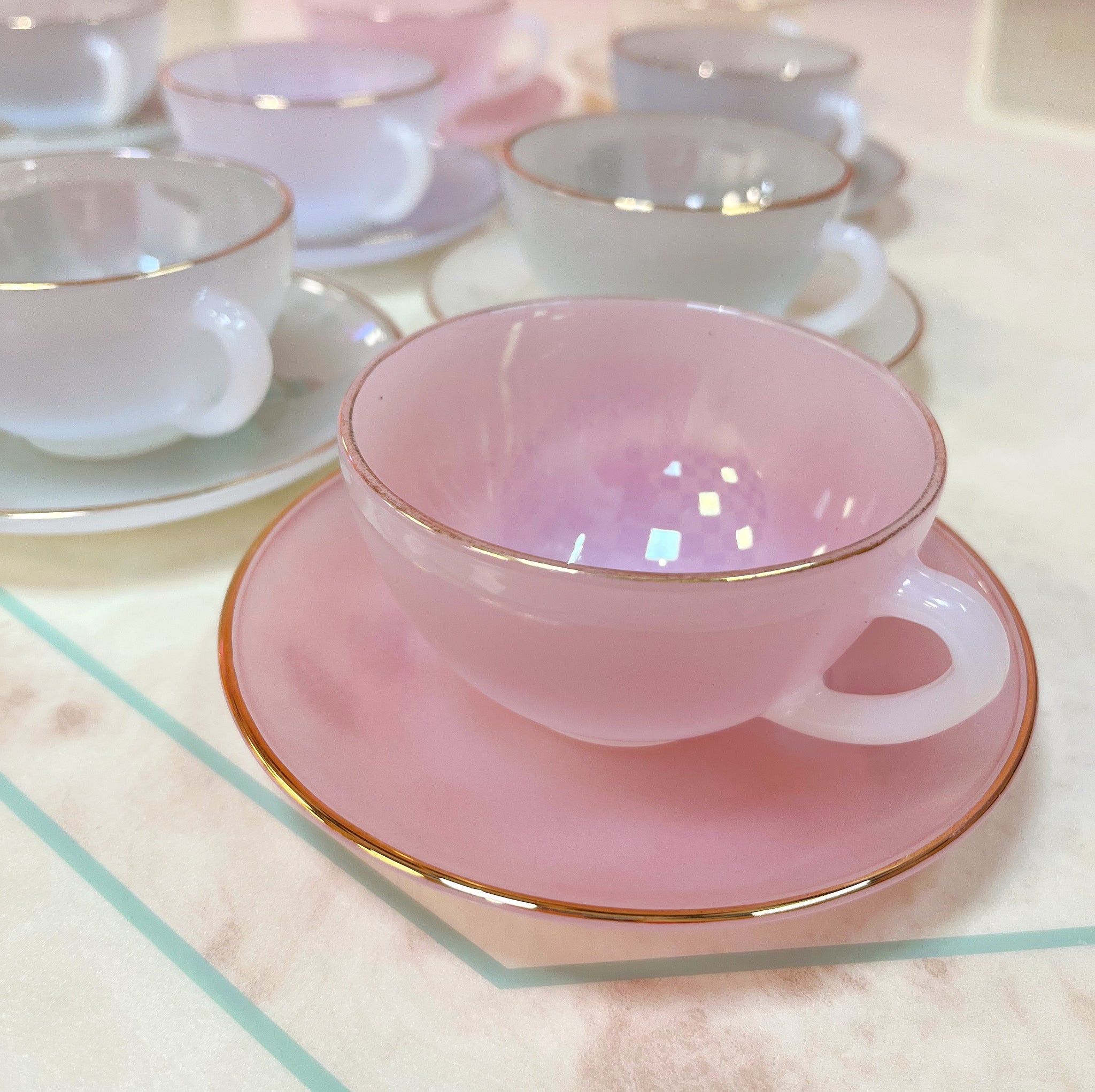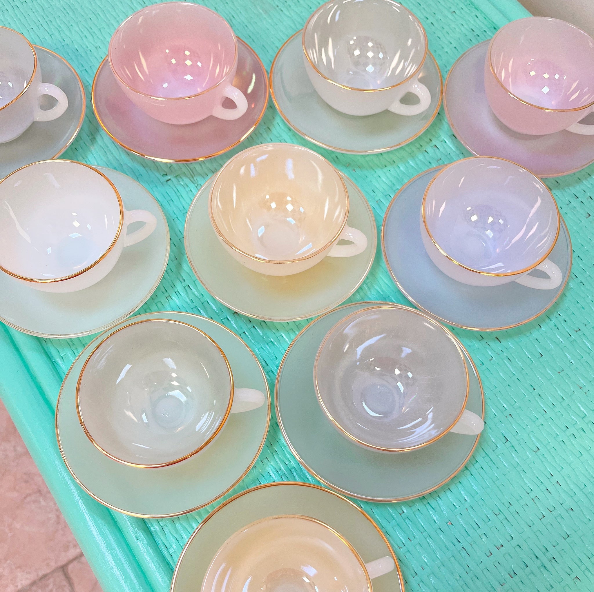 Splendide et iconiques service à café Arlequin pastel signé Arcopal, daté des années 60 : une pièce rare et délicieusement chic.