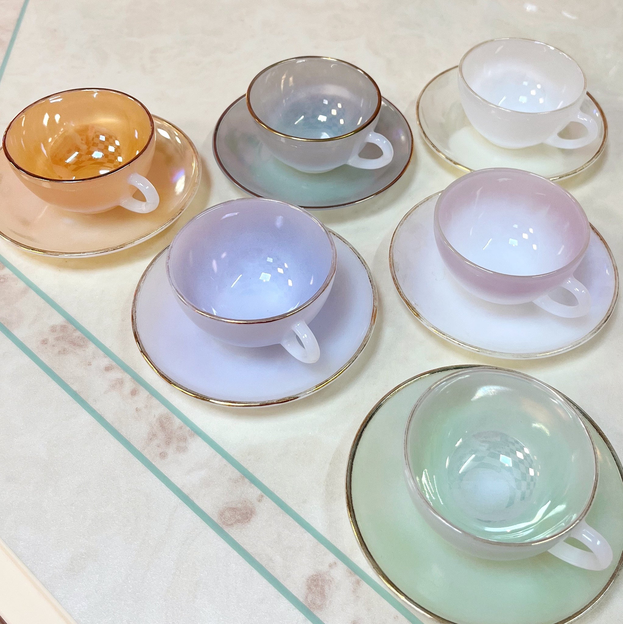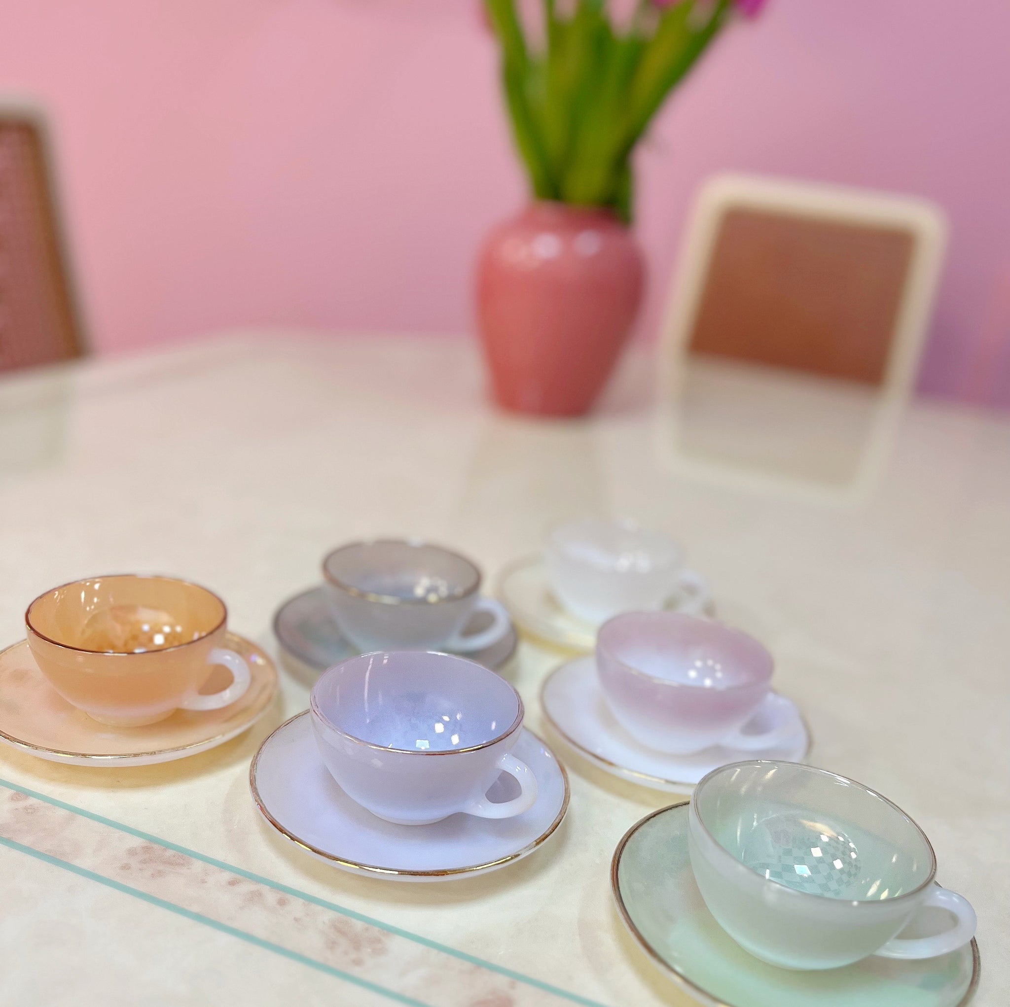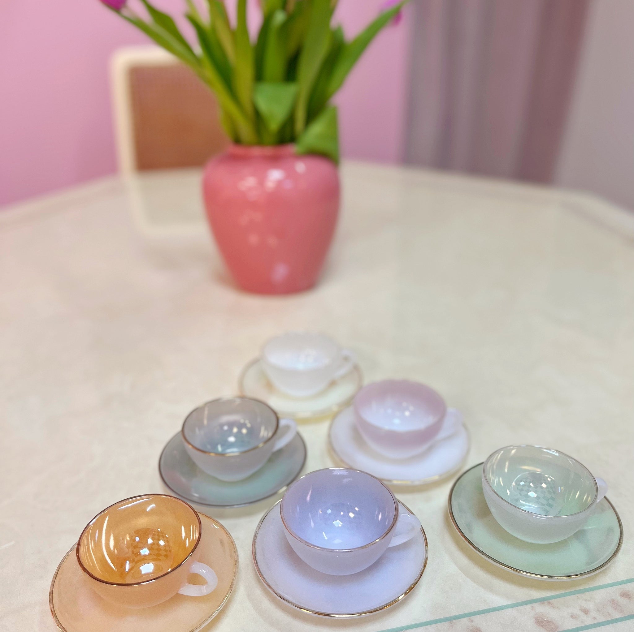 Splendide service de 6 tasses et sous tasses à café en verre opalescent pastel « Arlequin » de la maison Arcopal, vintage des années 60. Un service dont on admire la délicatesse des couleurs, et les délicieux liserais dorés. Et dans sa version mini, une rareté !