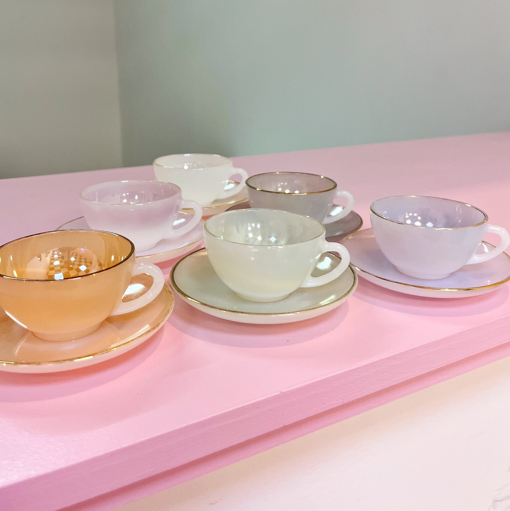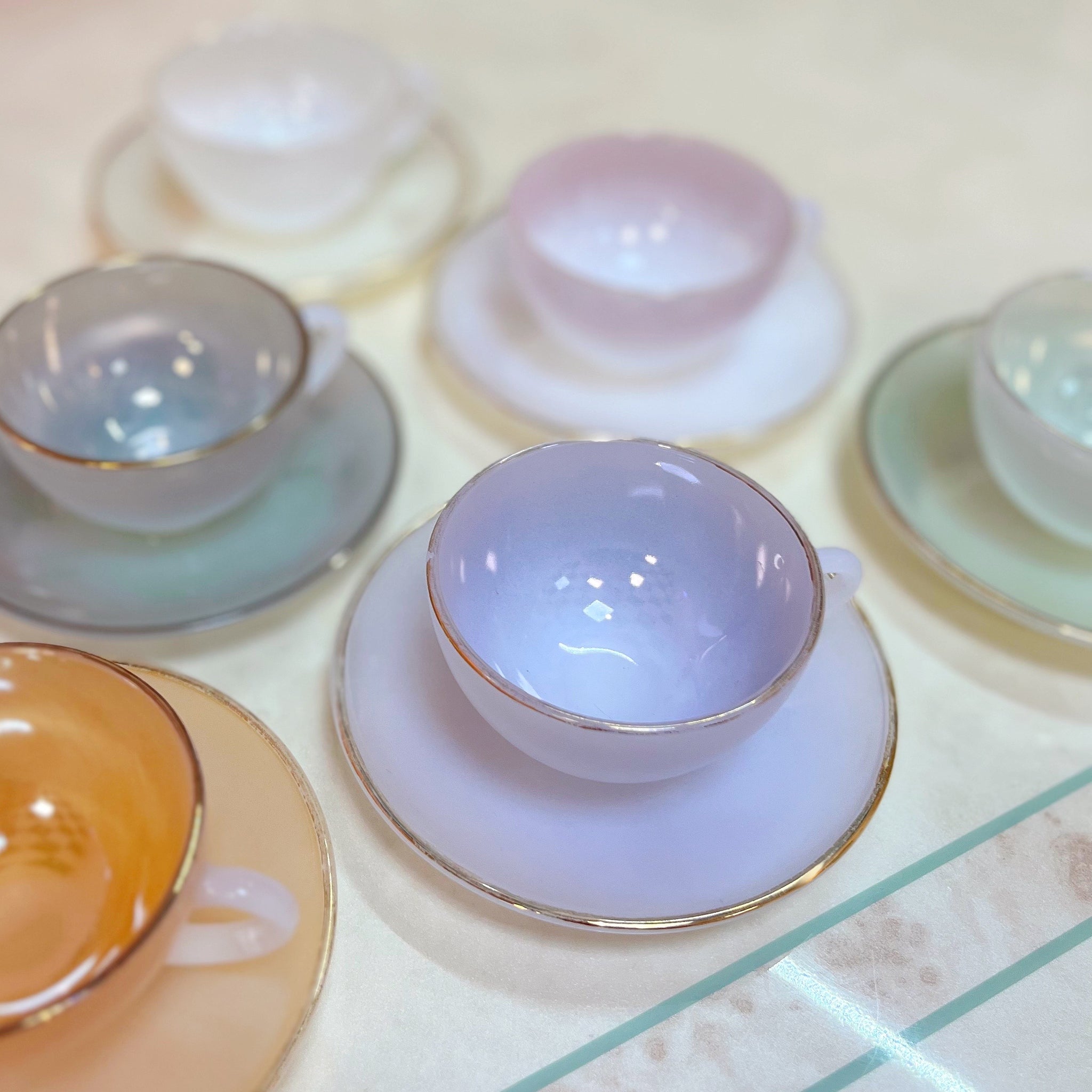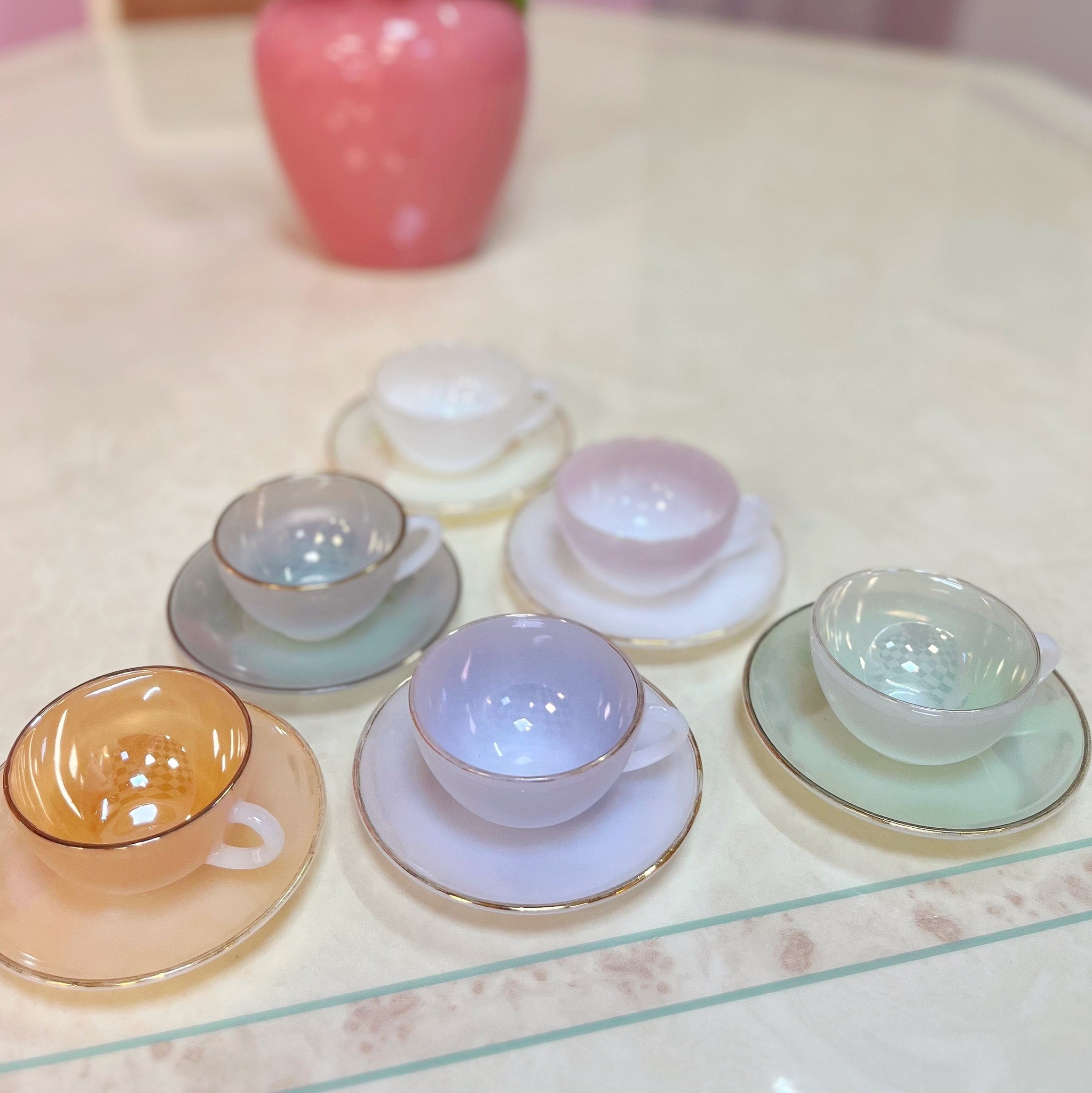 Splendide service de 6 tasses et sous tasses à café en verre opalescent pastel « Arlequin » de la maison Arcopal, vintage des années 60. Un service dont on admire la délicatesse des couleurs, et les délicieux liserais dorés. Et dans sa version mini, une rareté !